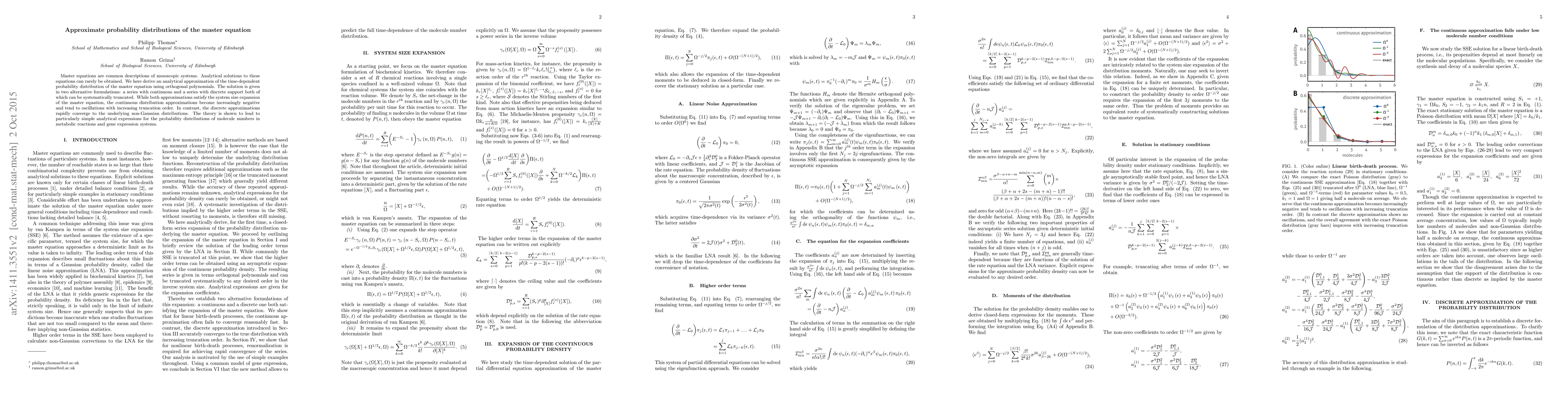 Master equations are common descriptions of mesoscopic systems. Analytical solutions to these equations can rarely be obtained. We here derive an analytical approximation of the time-dependent probability distribution of the master equation using orthogonal polynomials. The solution is given in two alternative formulations: a series with continuous and a series with discrete support both of which can be systematically truncated. While both approximations satisfy the system size expansion of the master equation, the continuous distribution approximations become increasingly negative and tend to oscillations with increasing truncation order. In contrast, the discrete approximations rapidly converge to the underlying non-Gaussian distributions. The theory is shown to lead to particularly simple analytical expressions for the probability distributions of molecule numbers in metabolic reactions and gene expression systems.