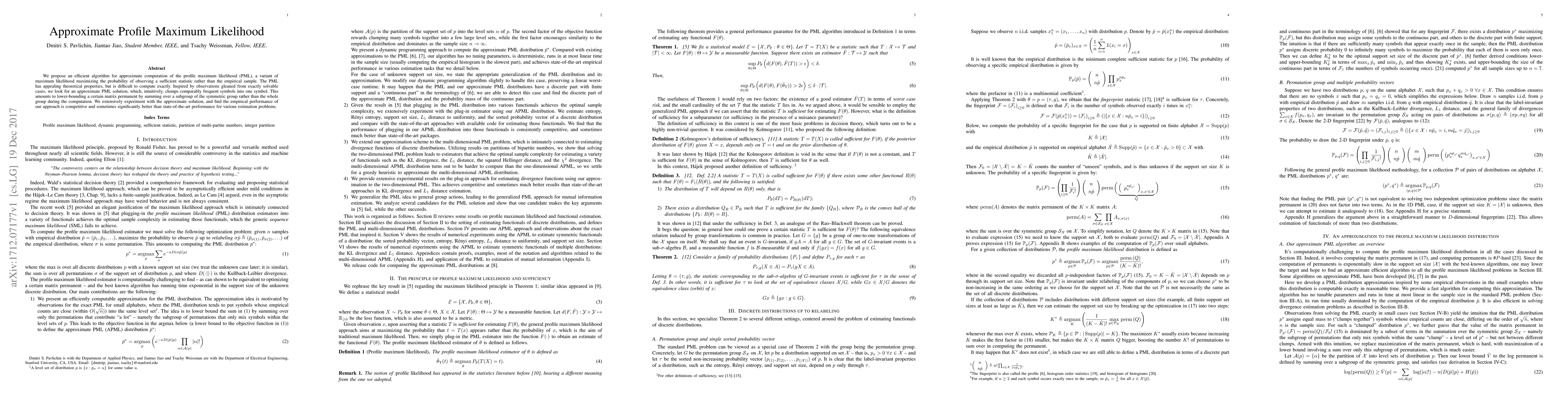 This paper proposes an efficient algorithm for computing an approximate profile maximum likelihood (PML), which maximizes the probability of sufficient statistics instead of the empirical sample. The authors find that their approach, which involves summing over a subgroup of the symmetric group, performs competitively and sometimes better than existing methods for various estimation problems.