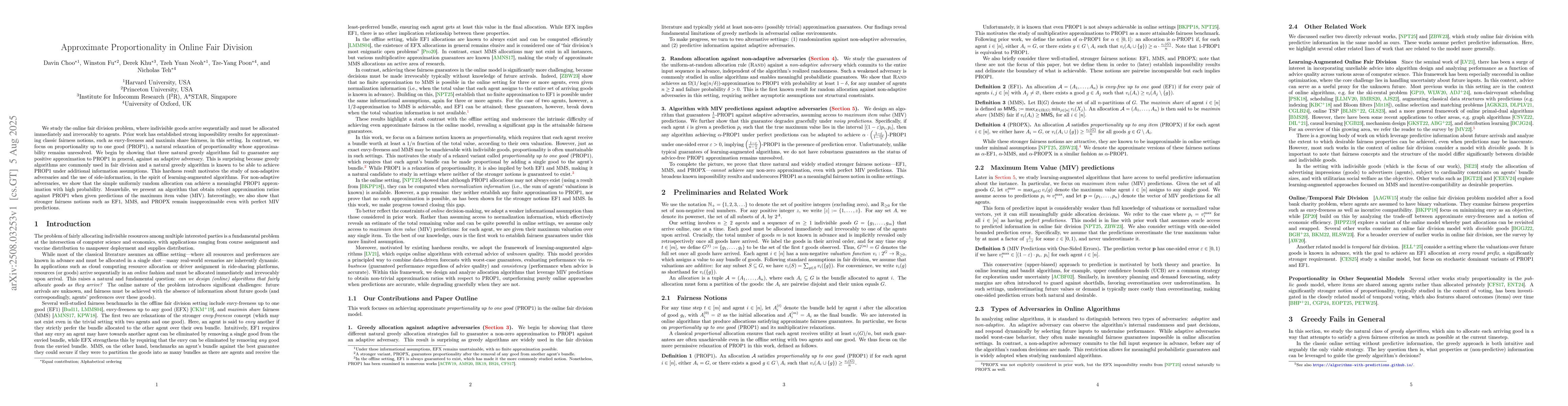 We study the online fair division problem, where indivisible goods arrive sequentially and must be allocated immediately and irrevocably to agents. Prior work has established strong impossibility results for approximating classic fairness notions, such as envy-freeness and maximin share fairness, in this setting. In contrast, we focus on proportionality up to one good (PROP1), a natural relaxation of proportionality whose approximability remains unresolved. We begin by showing that three natural greedy algorithms fail to guarantee any positive approximation to PROP1 in general, against an adaptive adversary. This is surprising because greedy algorithms are commonly used in fair division and a natural greedy algorithm is known to be able to achieve PROP1 under additional information assumptions. This hardness result motivates the study of non-adaptive adversaries and the use of side-information, in the spirit of learning-augmented algorithms. For non-adaptive adversaries, we show that the simple uniformly random allocation can achieve a meaningful PROP1 approximation with high probability. Meanwhile, we present an algorithm that obtain robust approximation ratios against PROP1 when given predictions of the maximum item value (MIV). Interestingly, we also show that stronger fairness notions such as EF1, MMS, and PROPX remain inapproximable even with perfect MIV predictions.