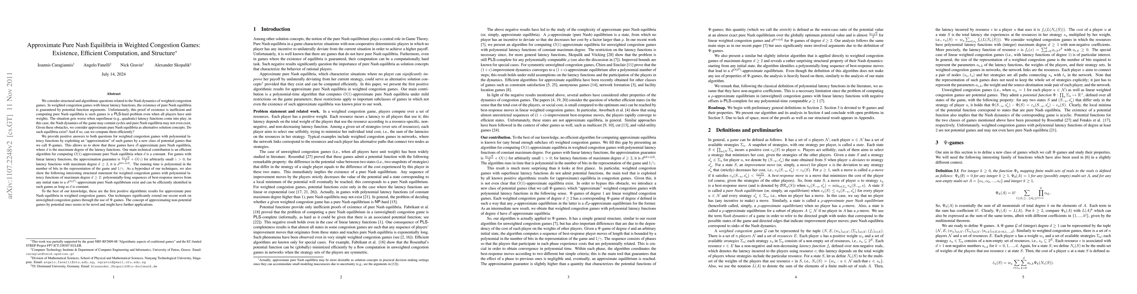 This paper investigates the existence and efficient computation of approximate pure Nash equilibria in weighted congestion games with polynomial latency functions. It introduces $\Psi$-games to show the existence of $d!$-approximate equilibria and provides an efficient algorithm for computing O(1)-approximate equilibria when the maximum degree $d$ is constant.