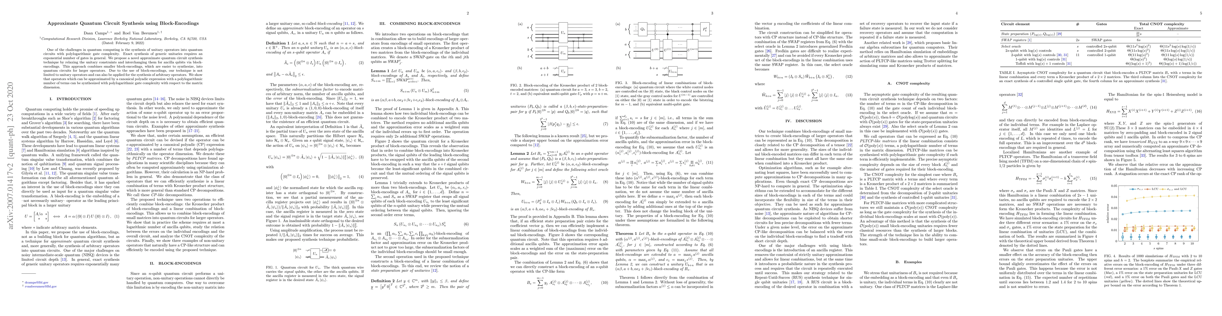 This paper proposes a novel technique for approximate quantum circuit synthesis using block-encodings, which allows for the construction of quantum circuits with polylogarithmic gate complexity for operators that can be approximated by a canonical polyadic expression. The method leverages smaller, easier-to-synthesize block-encodings to achieve the desired approximation.