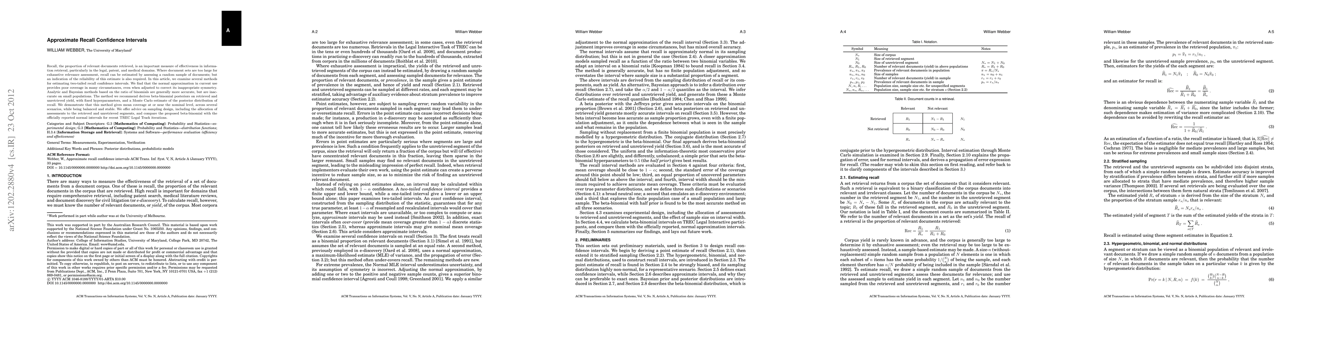 This paper proposes a method for estimating recall confidence intervals in large document sets, finding that normal approximation methods often fail, while beta-binomial posteriors with Monte Carlo estimates provide more accurate and balanced results, especially when compared to official TREC Legal Track intervals.