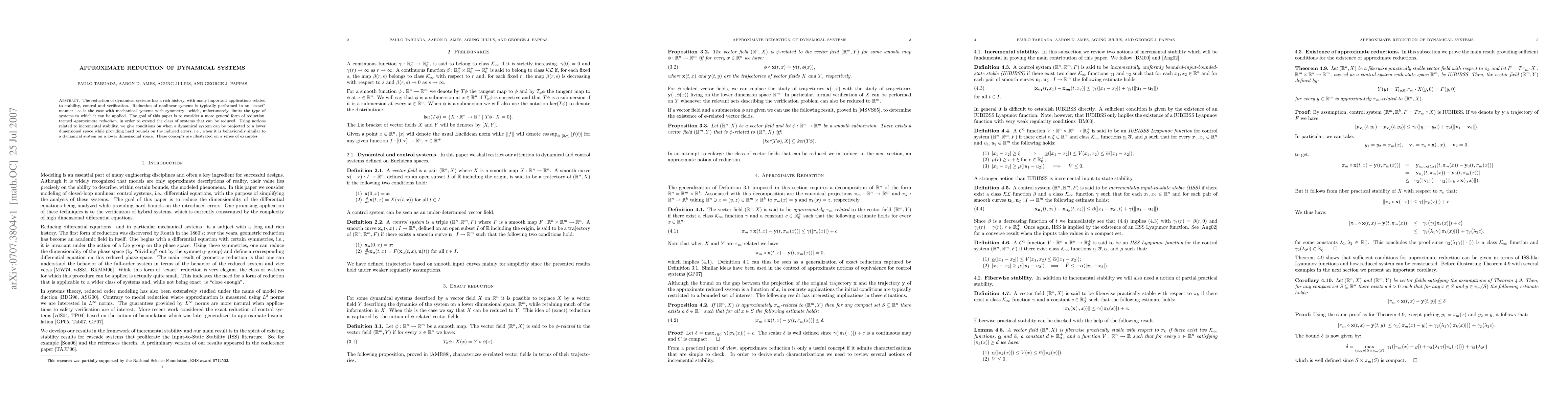 This paper explores approximate reduction of dynamical systems to extend applicability beyond exact methods, focusing on providing hard bounds on induced errors through incremental stability. Examples demonstrate the effectiveness of this approach in reducing the dimensionality of nonlinear systems.