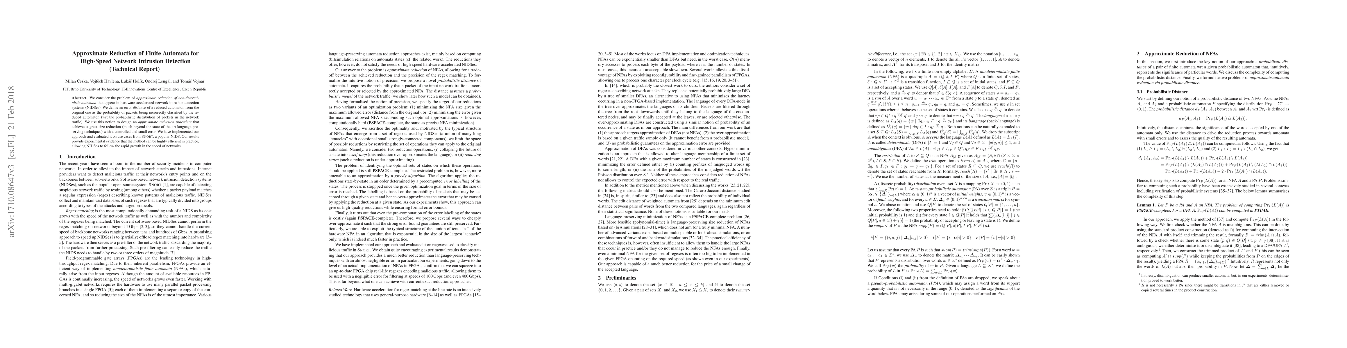 We consider the problem of approximate reduction of non-deterministic automata that appear in hardware-accelerated network intrusion detection systems (NIDSes). We define an error distance of a reduced automaton from the original one as the probability of packets being incorrectly classified by the reduced automaton (wrt the probabilistic distribution of packets in the network traffic). We use this notion to design an approximate reduction procedure that achieves a great size reduction (much beyond the state-of-the-art language-preserving techniques) with a controlled and small error. We have implemented our approach and evaluated it on use cases from Snort, a popular NIDS. Our results provide experimental evidence that the method can be highly efficient in practice, allowing NIDSes to follow the rapid growth in the speed of networks.