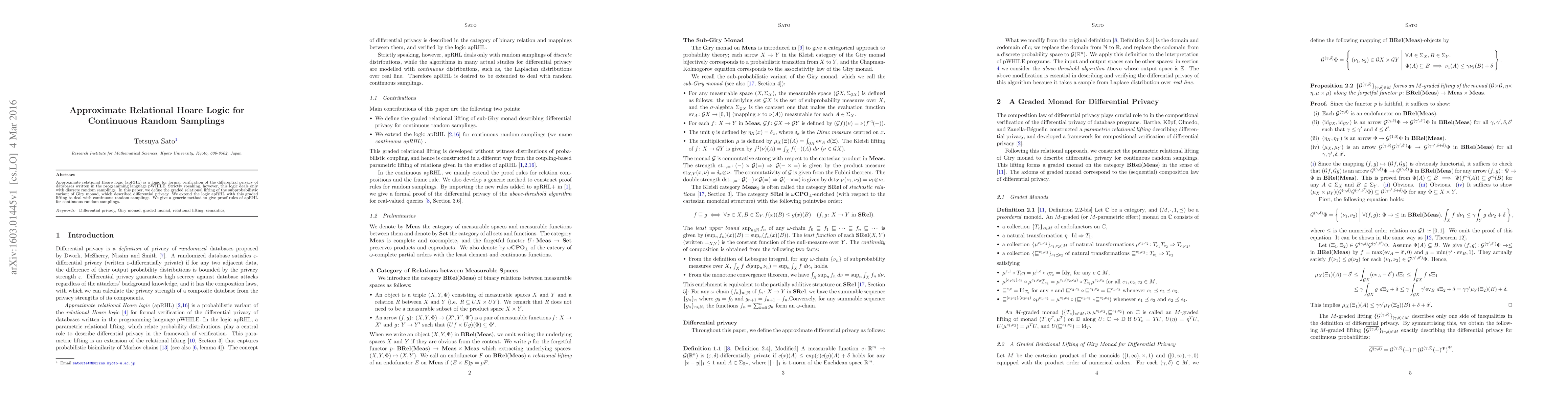 This paper introduces an extension of approximate relational Hoare logic (apRHL) to handle continuous random samplings for differential privacy in databases. The authors define a graded relational lifting of the subprobabilistic Giry monad and provide a generic method for formulating proof rules for continuous samplings.