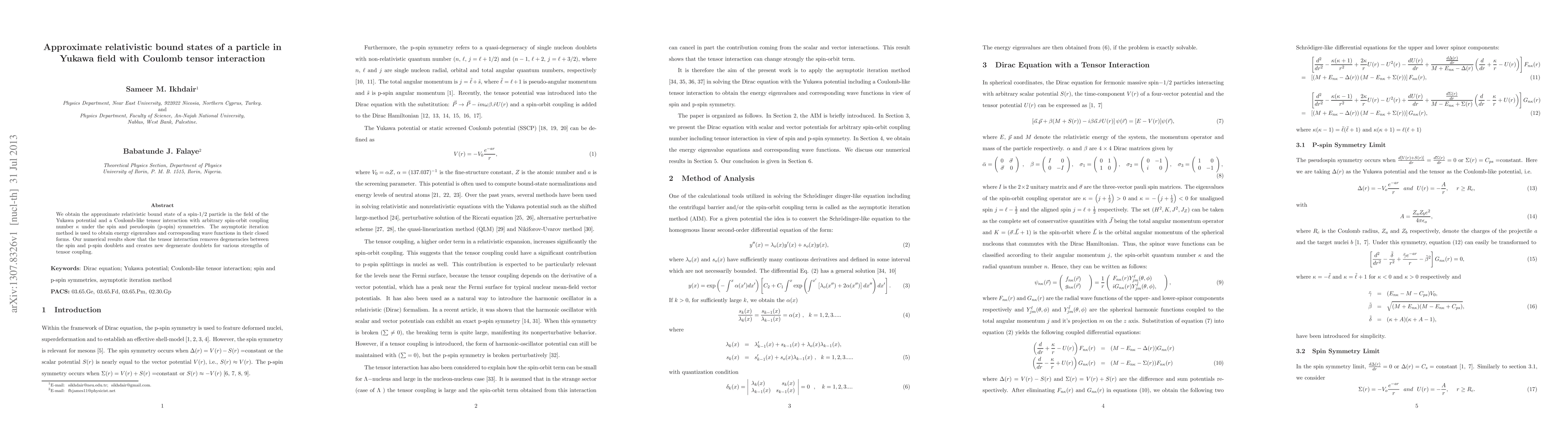 We obtain the approximate relativistic bound state of a spin-1/2 particle in the field of the Yukawa potential and a Coulomb-like tensor interaction with arbitrary spin-orbit coupling number k under the spin and pseudospin (p-spin) symmetries. The asymptotic iteration method is used to obtain energy eigenvalues and corresponding wave functions in their closed forms. Our numerical results show that the tensor interaction removes degeneracies between the spin and p-spin doublets and creates new degenerate doublets for various strengths of tensor coupling.
