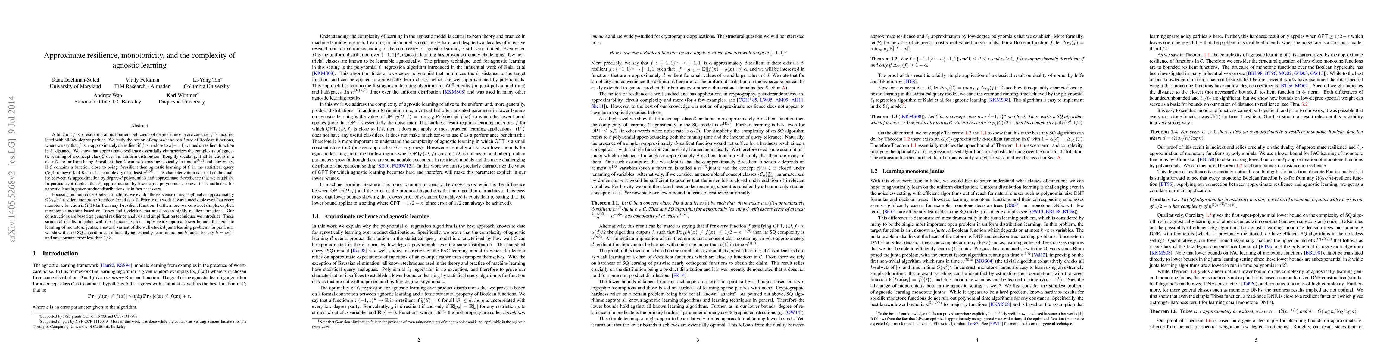 A function $f$ is $d$-resilient if all its Fourier coefficients of degree at most $d$ are zero, i.e., $f$ is uncorrelated with all low-degree parities. We study the notion of $\mathit{approximate}$ $\mathit{resilience}$ of Boolean functions, where we say that $f$ is $\alpha$-approximately $d$-resilient if $f$ is $\alpha$-close to a $[-1,1]$-valued $d$-resilient function in $\ell_1$ distance. We show that approximate resilience essentially characterizes the complexity of agnostic learning of a concept class $C$ over the uniform distribution. Roughly speaking, if all functions in a class $C$ are far from being $d$-resilient then $C$ can be learned agnostically in time $n^{O(d)}$ and conversely, if $C$ contains a function close to being $d$-resilient then agnostic learning of $C$ in the statistical query (SQ) framework of Kearns has complexity of at least $n^{\Omega(d)}$. This characterization is based on the duality between $\ell_1$ approximation by degree-$d$ polynomials and approximate $d$-resilience that we establish. In particular, it implies that $\ell_1$ approximation by low-degree polynomials, known to be sufficient for agnostic learning over product distributions, is in fact necessary. Focusing on monotone Boolean functions, we exhibit the existence of near-optimal $\alpha$-approximately $\widetilde{\Omega}(\alpha\sqrt{n})$-resilient monotone functions for all $\alpha>0$. Prior to our work, it was conceivable even that every monotone function is $\Omega(1)$-far from any $1$-resilient function. Furthermore, we construct simple, explicit monotone functions based on ${\sf Tribes}$ and ${\sf CycleRun}$ that are close to highly resilient functions. Our constructions are based on a fairly general resilience analysis and amplification. These structural results, together with the characterization, imply nearly optimal lower bounds for agnostic learning of monotone juntas.