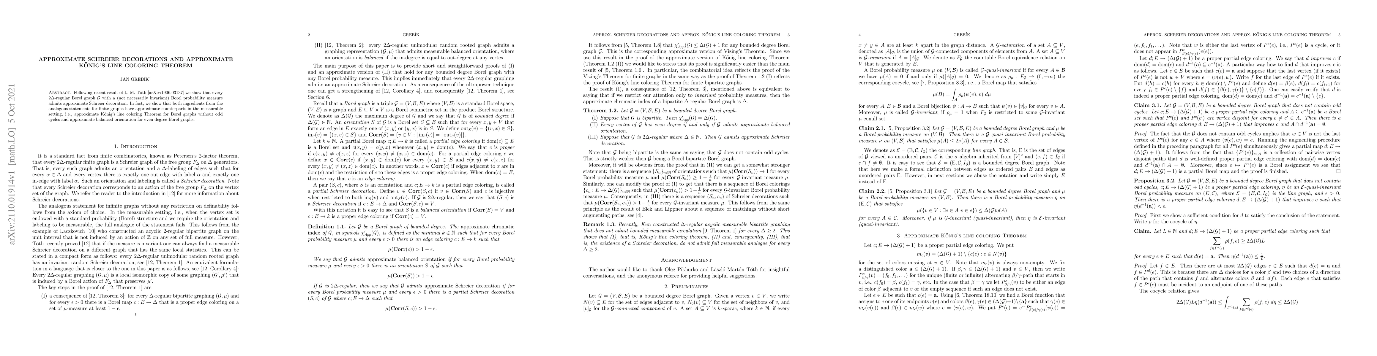 Following recent result of L. M. T\' oth [arXiv:1906.03137] we show that every $2\Delta$-regular Borel graph $\mathcal{G}$ with a (not necessarily invariant) Borel probability measure admits approximate Schreier decoration. In fact, we show that both ingredients from the analogous statements for finite graphs have approximate counterparts in the measurable setting, i.e., approximate K\H{o}nig's line coloring Theorem for Borel graphs without odd cycles and approximate balanced orientation for even degree Borel graphs.