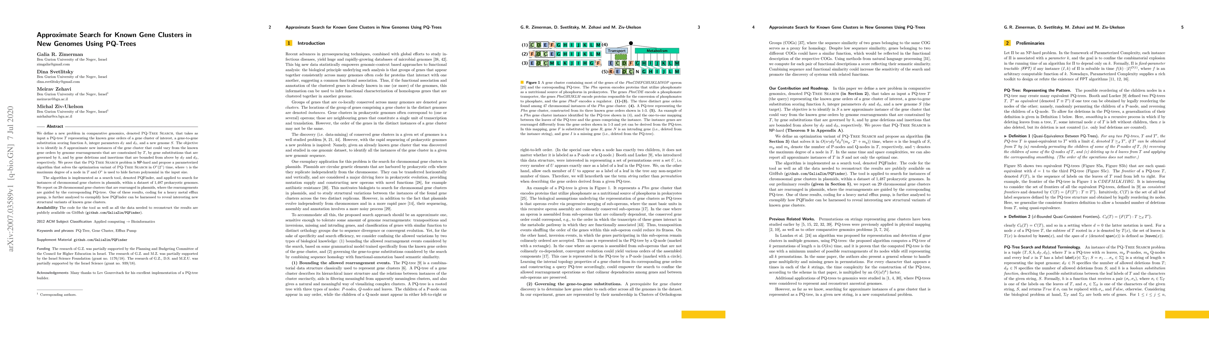 We define a new problem in comparative genomics, denoted PQ-Tree Search, that takes as input a PQ-tree $T$ representing the known gene orders of a gene cluster of interest, a gene-to-gene substitution scoring function $h$, integer parameters $d_T$ and $d_S$, and a new genome $S$. The objective is to identify in $S$ approximate new instances of the gene cluster that could vary from the known gene orders by genome rearrangements that are constrained by $T$, by gene substitutions that are governed by $h$, and by gene deletions and insertions that are bounded from above by $d_T$ and $d_S$, respectively. We prove that the PQ-Tree Search problem is NP-hard and propose a parameterized algorithm that solves the optimization variant of PQ-Tree Search in $O^*(2^{\gamma})$ time, where $\gamma$ is the maximum degree of a node in $T$ and $O^*$ is used to hide factors polynomial in the input size. The algorithm is implemented as a search tool, denoted PQFinder, and applied to search for instances of chromosomal gene clusters in plasmids, within a dataset of 1,487 prokaryotic genomes. We report on 29 chromosomal gene clusters that are rearranged in plasmids, where the rearrangements are guided by the corresponding PQ-tree. One of these results, coding for a heavy metal efflux pump, is further analysed to exemplify how PQFinder can be harnessed to reveal interesting new structural variants of known gene clusters. The code for the tool as well as all the data needed to reconstruct the results are publicly available on GitHub (github.com/GaliaZim/PQFinder).