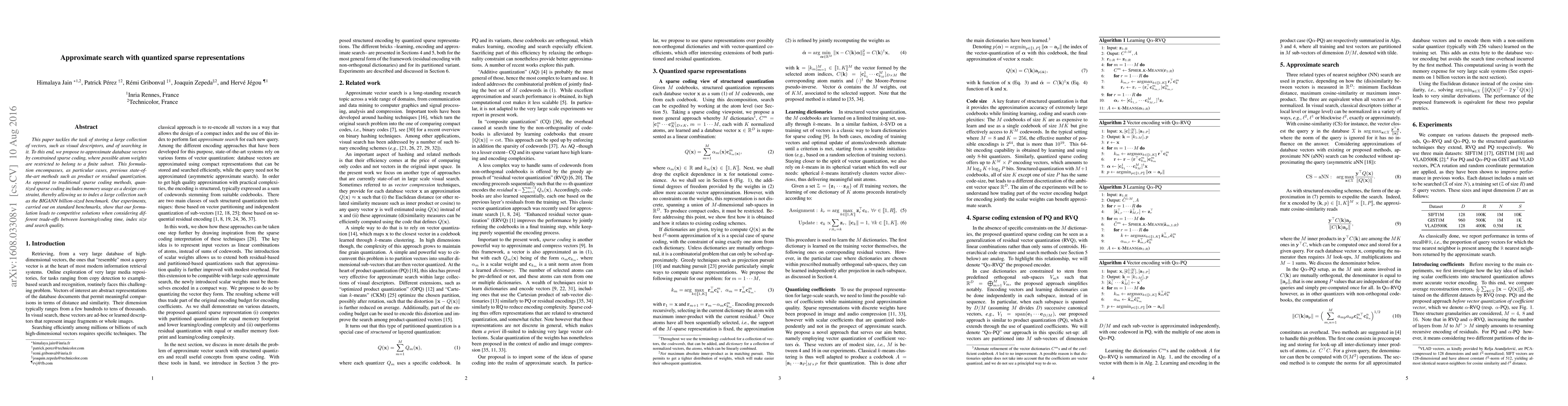 This paper tackles the task of storing a large collection of vectors, such as visual descriptors, and of searching in it. To this end, we propose to approximate database vectors by constrained sparse coding, where possible atom weights are restricted to belong to a finite subset. This formulation encompasses, as particular cases, previous state-of-the-art methods such as product or residual quantization. As opposed to traditional sparse coding methods, quantized sparse coding includes memory usage as a design constraint, thereby allowing us to index a large collection such as the BIGANN billion-sized benchmark. Our experiments, carried out on standard benchmarks, show that our formulation leads to competitive solutions when considering different trade-offs between learning/coding time, index size and search quality.