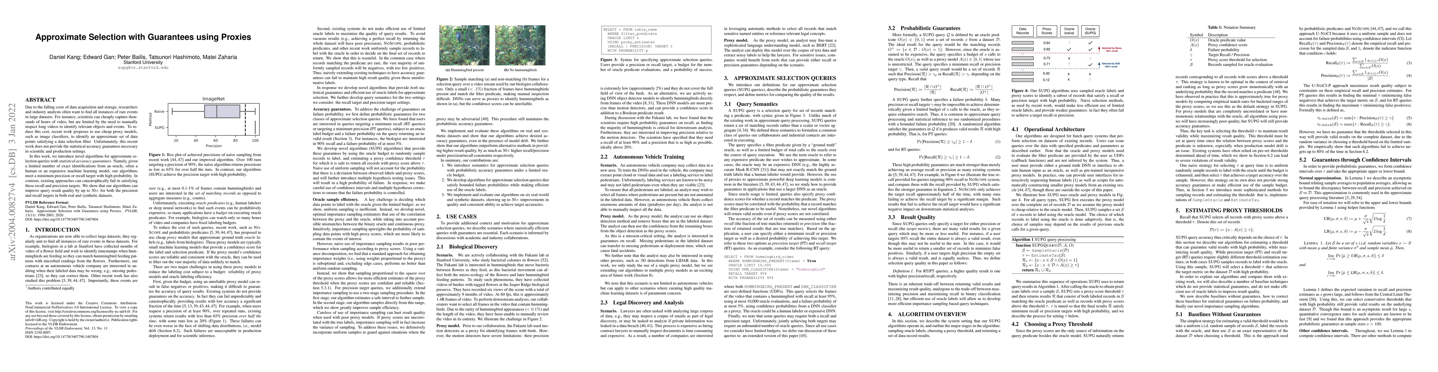 Due to the falling costs of data acquisition and storage, researchers and industry analysts often want to find all instances of rare events in large datasets. For instance, scientists can cheaply capture thousands of hours of video, but are limited by the need to manually inspect long videos to identify relevant objects and events. To reduce this cost, recent work proposes to use cheap proxy models, such as image classifiers, to identify an approximate set of data points satisfying a data selection filter. Unfortunately, this recent work does not provide the statistical accuracy guarantees necessary in scientific and production settings. In this work, we introduce novel algorithms for approximate selection queries with statistical accuracy guarantees. Namely, given a limited number of exact identifications from an oracle, often a human or an expensive machine learning model, our algorithms meet a minimum precision or recall target with high probability. In contrast, existing approaches can catastrophically fail in satisfying these recall and precision targets. We show that our algorithms can improve query result quality by up to 30x for both the precision and recall targets in both real and synthetic datasets.