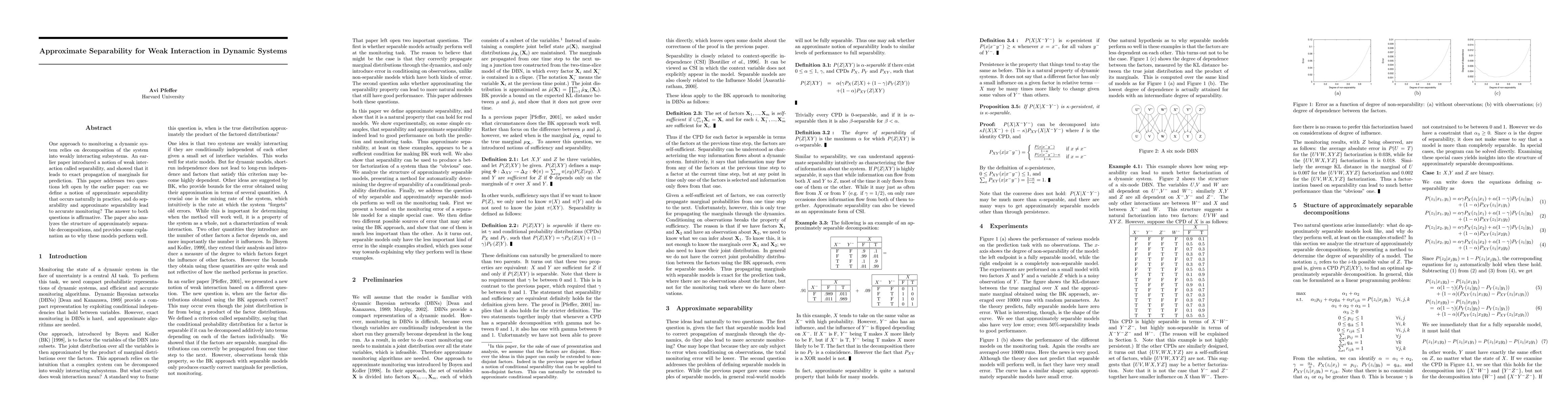 This paper introduces approximate separability for dynamic systems, addressing a gap in previous work on weak interaction. It confirms that both separability and approximate separability enable accurate system monitoring, and explores the structure of these decompositions, explaining their effectiveness.