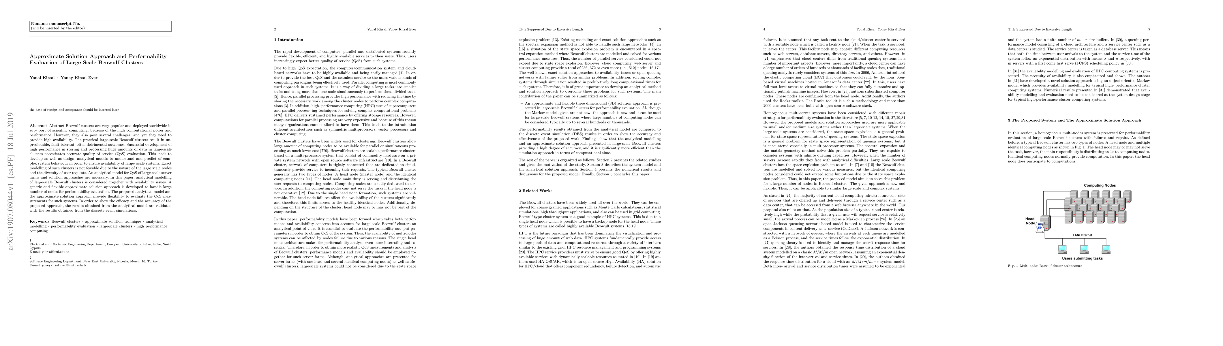 A new approach is presented for evaluating the performance of large-scale Beowulf clusters, aiming to ensure high availability and quality of service, with a focus on developing an approximate solution that can handle a large number of nodes.