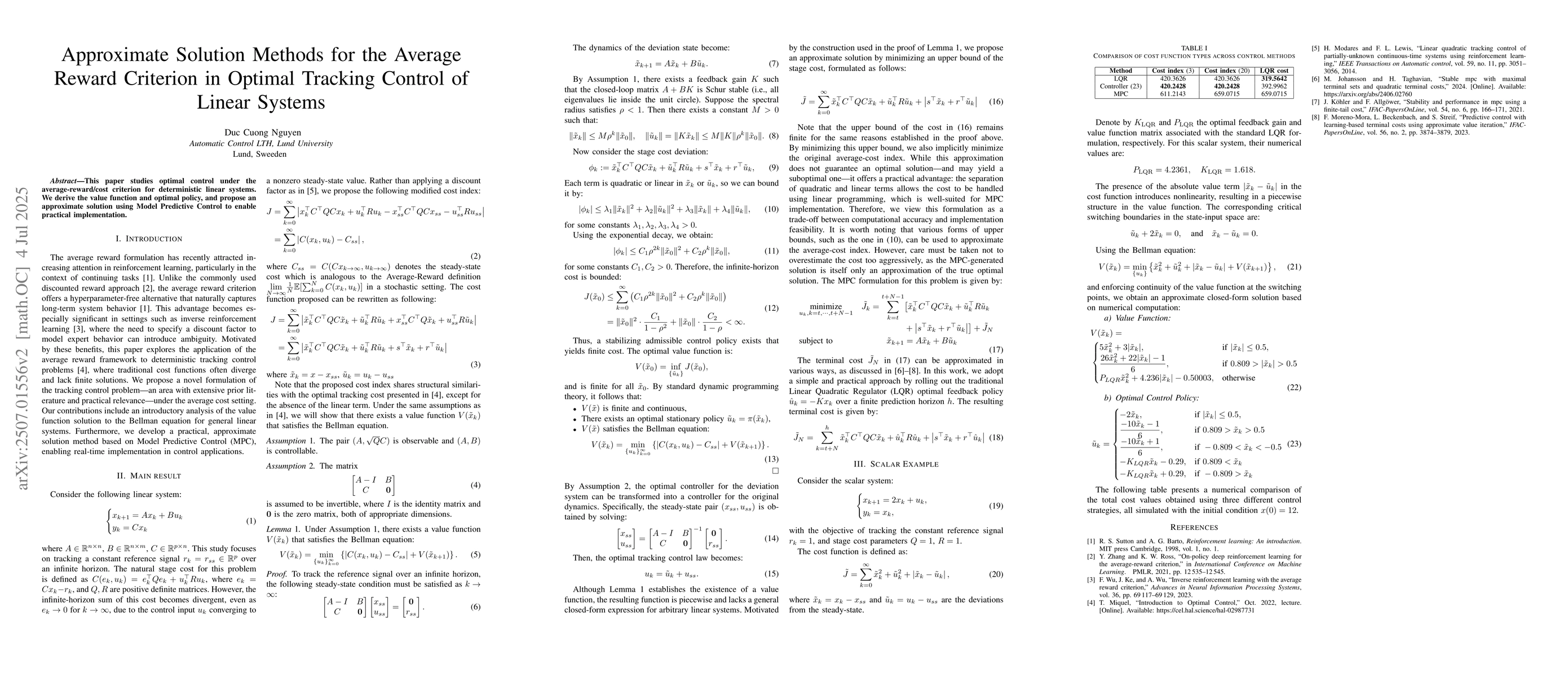 This paper studies optimal control under the average-reward/cost criterion for deterministic linear systems. We derive the value function and optimal policy, and propose an approximate solution using Model Predictive Control to enable practical implementation.