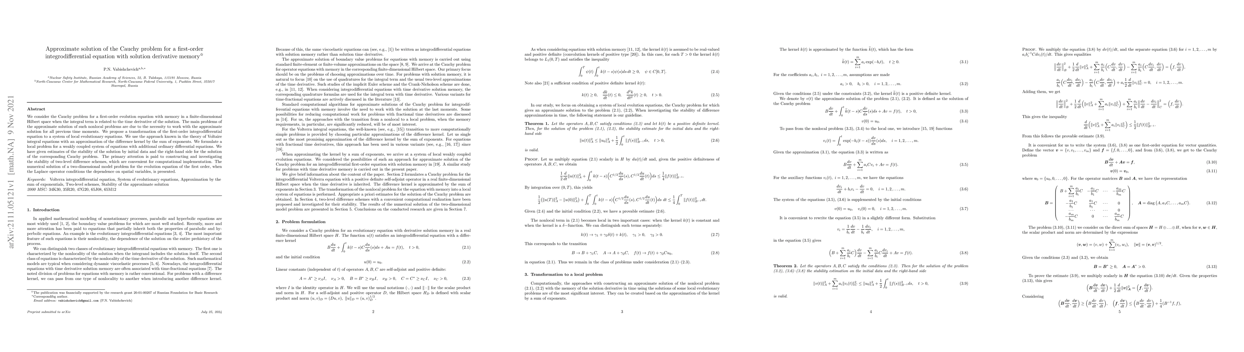 This research paper proposes a method to solve first-order integrodifferential equations with memory, transforming them into local evolutionary equations that can be approximated numerically. It also investigates the stability of the solution and presents numerical results for a two-dimensional model problem.