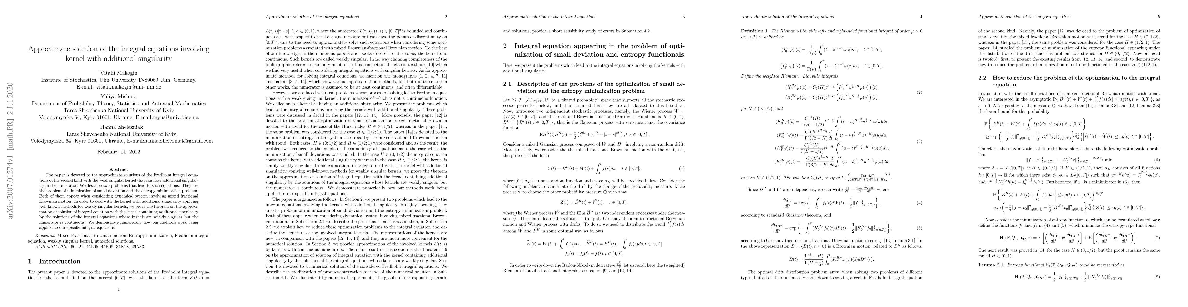 The paper is devoted to the approximate solutions of the Fredholm integral equations of the second kind with the weak singular kernel that can have additional singularity in the numerator. We describe two problems that lead to such equations. They are the problem of minimization of small deviation and the entropy minimization problem. Both of them appear when considering dynamical system involving mixed fractional Brownian motion. In order to deal with the kernel with additional singularity applying well-known methods for weakly singular kernels, we prove the theorem on the approximation of solution of integral equation with the kernel containing additional singularity by the solutions of the integral equations whose kernels are weakly singular but the numerator is continuous. We demonstrate numerically how our methods work being applied to our specific integral equations.