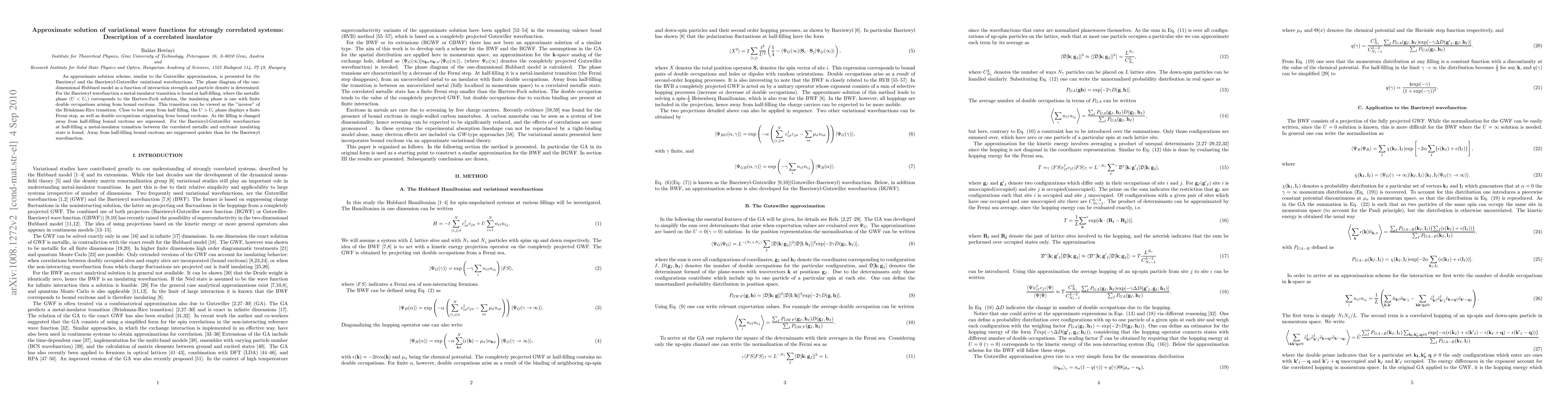 This paper presents an approximate solution scheme for Baeriswyl and Baeriswyl-Gutzwiller variational wavefunctions, revealing a metal-insulator transition at half-filling in the Hubbard model. The transition involves bound excitons, with the metallic phase corresponding to Hartree-Fock solutions and the insulating phase featuring finite double occupations from excitons.