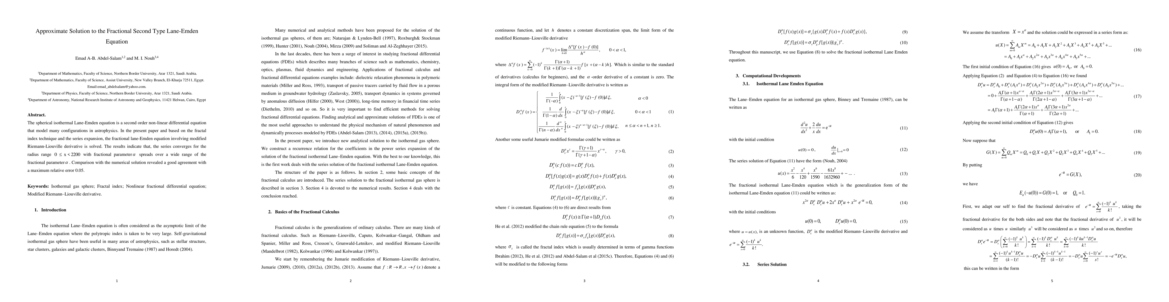 This paper presents an approximate solution to the fractional second type Lane-Emden equation using the fractal index technique and series expansion. The results show good convergence and agreement with numerical solutions, with a maximum relative error of 0.05.