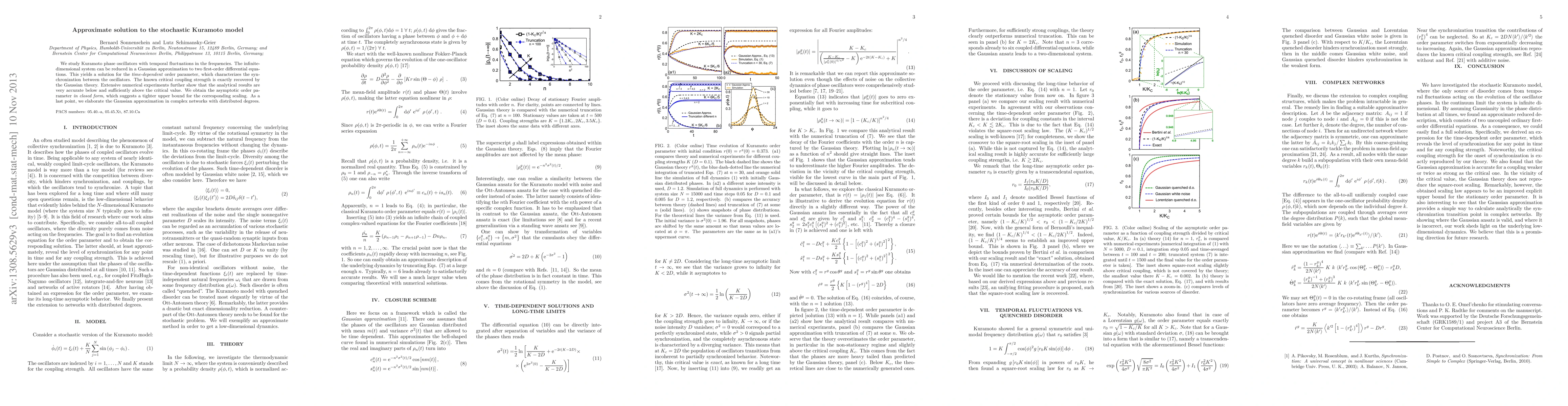 We study Kuramoto phase oscillators with temporal fluctuations in the frequencies. The infinite-dimensional system can be reduced in a Gaussian approximation to two first-order differential equations. This yields a solution for the \emph{time-dependent} order parameter, which characterizes the synchronization between the oscillators. The known critical coupling strength is exactly recovered by the Gaussian theory. Extensive numerical experiments further show that the analytical results are very accurate below and sufficiently above the critical value. We obtain the asymptotic order parameter \emph{in closed form}, which suggests a tighter upper bound for the corresponding scaling. As a last point, we elaborate the Gaussian approximation in complex networks with distributed degrees.