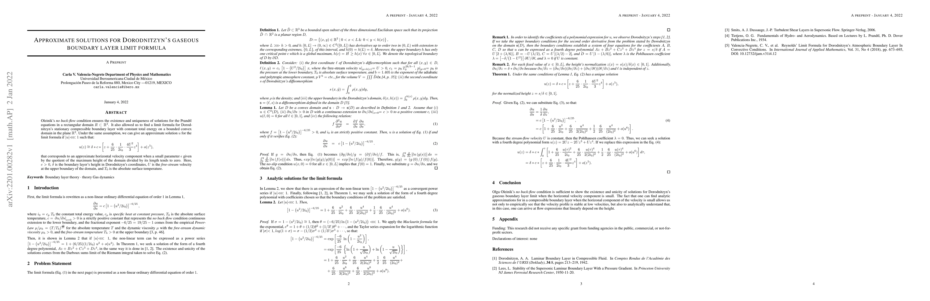 This paper provides an approximate solution for Dorodnitzyn's gaseous boundary layer limit under Oleinik's no back-flow condition, showing that when a small parameter tends to zero, the horizontal velocity component can be approximated by a formula involving the free-stream velocity and the boundary layer's height.