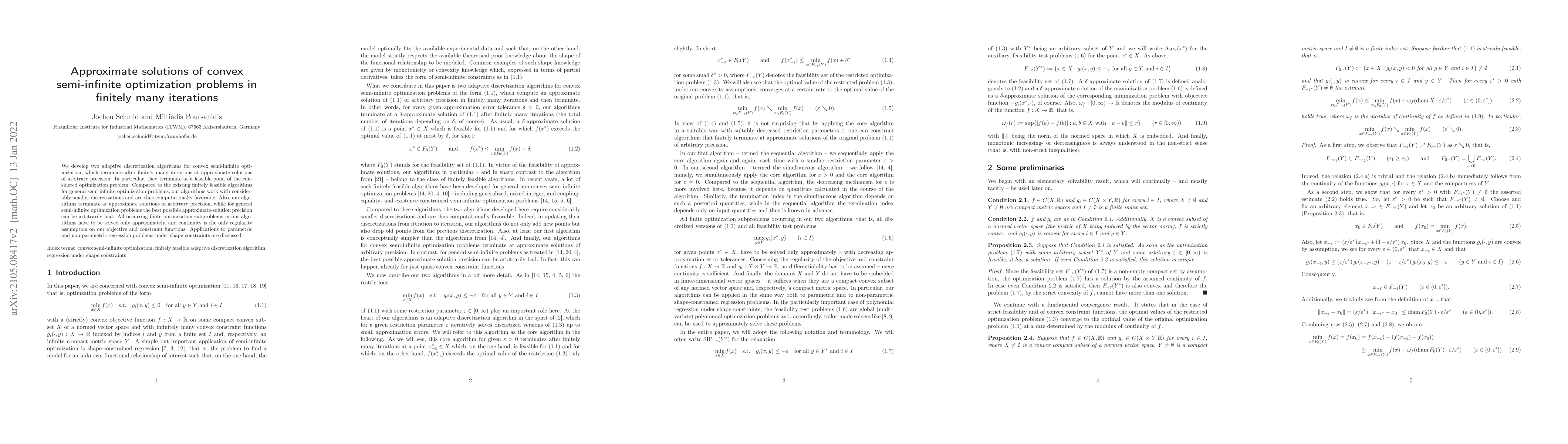This research introduces adaptive discretization algorithms for convex semi-infinite optimization, ensuring finitely many iterations to find approximate solutions of any desired precision. These algorithms require smaller discretizations and approximate solutions for finite subproblems, making them computationally efficient compared to existing methods. They also apply to regression problems with shape constraints.