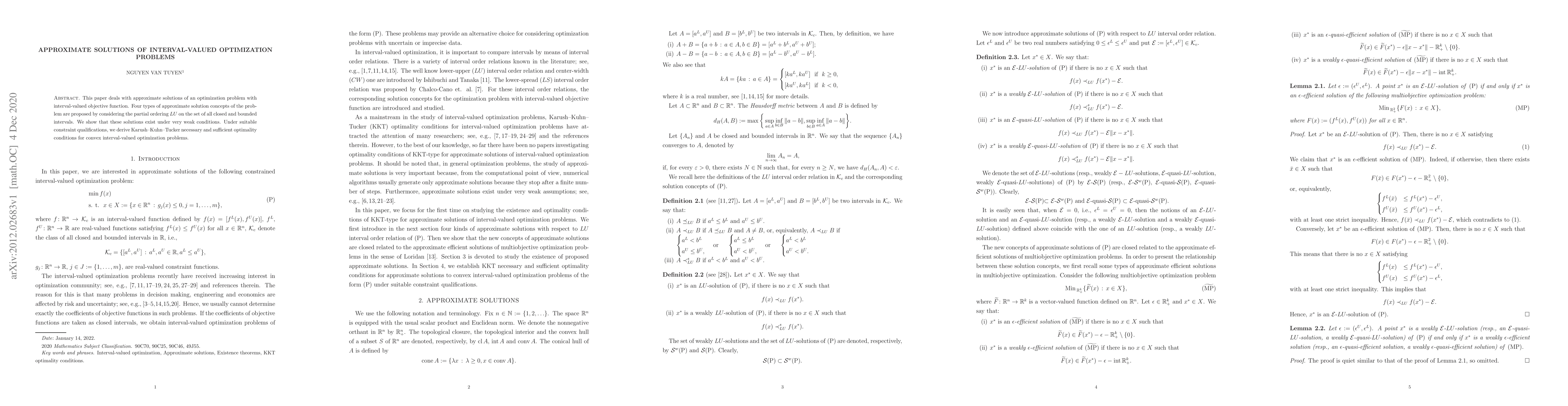 This paper proposes four types of approximate solutions for interval-valued optimization problems, utilizing the $LU$ partial ordering. It establishes the existence of these solutions under minimal conditions and derives necessary and sufficient optimality conditions for convex problems.