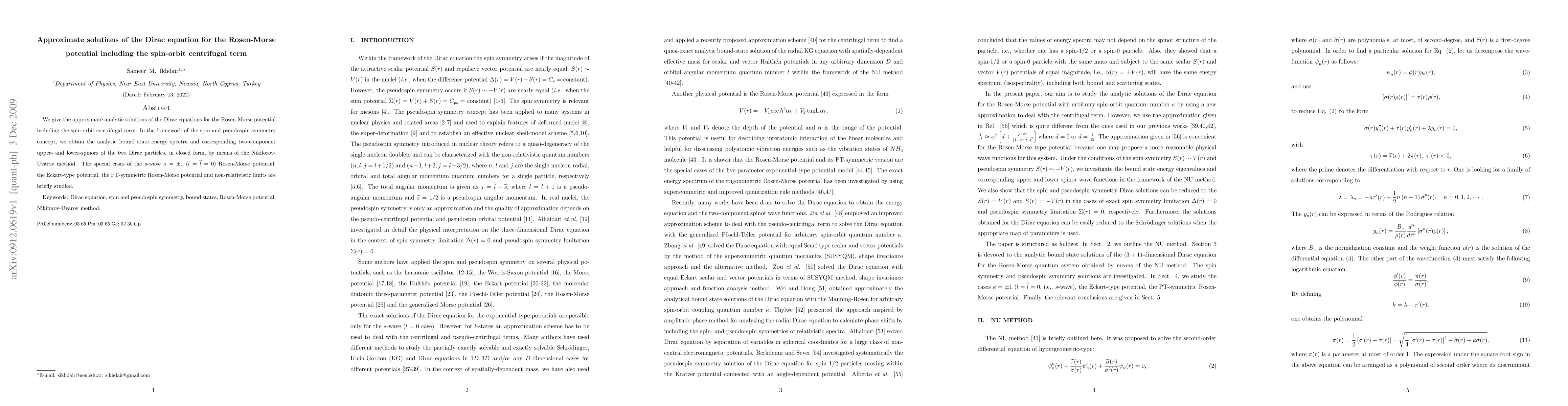 This paper provides approximate analytic solutions for the Dirac equation under the Rosen-Morse potential, incorporating the spin-orbit centrifugal term, and utilizes the spin and pseudospin symmetry framework. The solutions include closed-form expressions for bound state energy spectra and corresponding spinors derived via the Nikiforov-Uvarov method.
