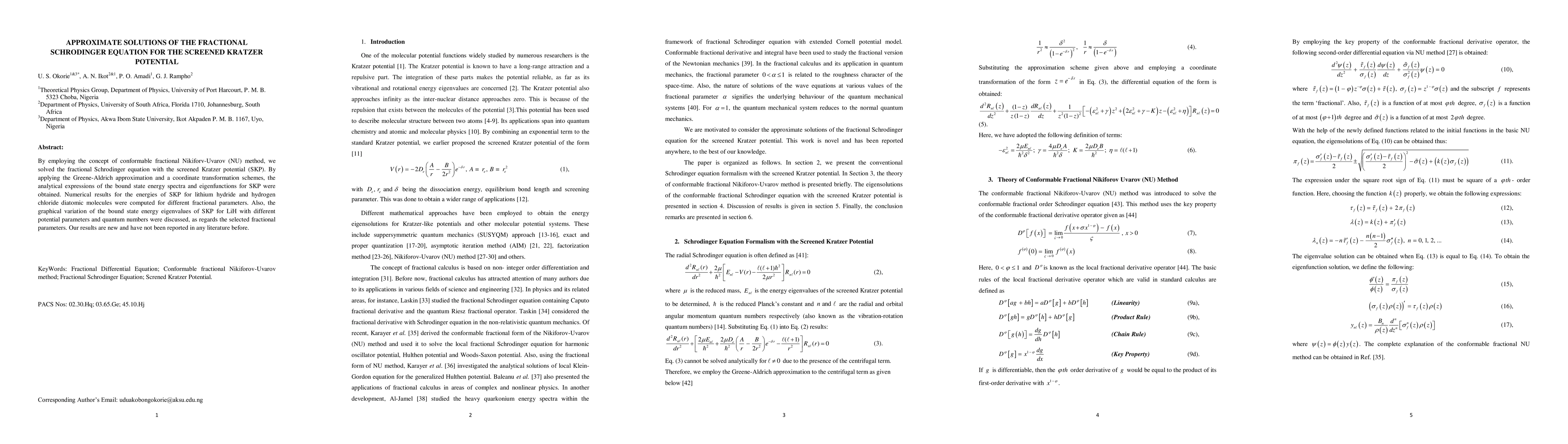 By employing the concept of conformable fractional Nikiforv-Uvarov (NU) method, we solved the fractional Schrodinger equation with the screened Kratzer potential (SKP). By applying the Greene-Aldrich approximation and a coordinate transformation schemes, the analytical expressions of the bound state energy spectra and eigenfunctions for SKP were obtained. Numerical results for the energies of SKP for lithium hydride and hydrogen chloride diatomic molecules were computed for different fractional parameters. Also, the graphical variation of the bound state energy eigenvalues of SKP for LiH with different potential parameters and quantum numbers were discussed, as regards the selected fractional parameters. Our results are new and have not been reported in any literature before.