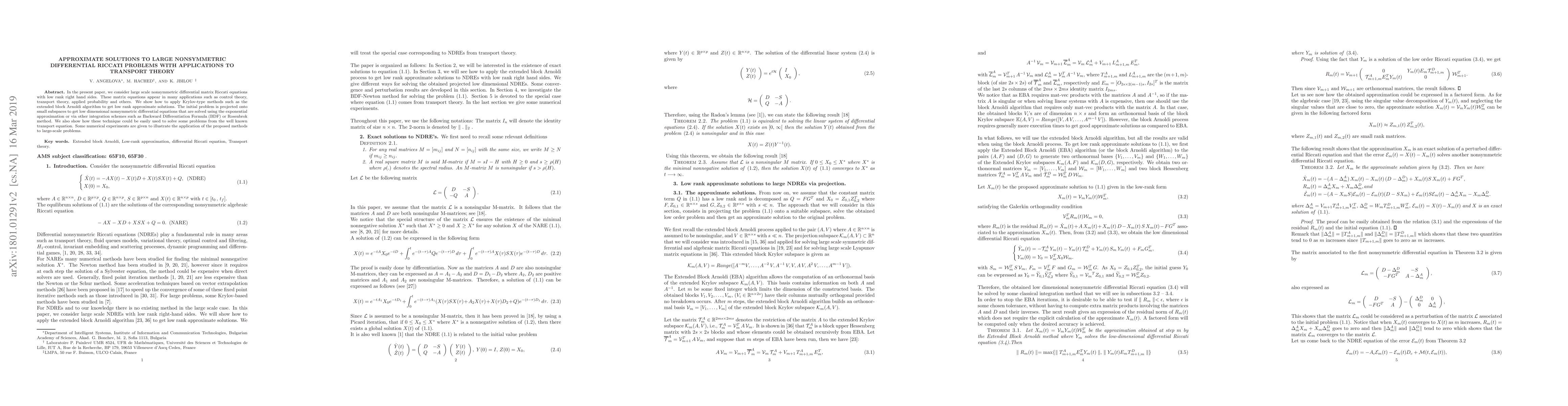 This paper proposes Krylov-type methods, specifically the extended block Arnoldi algorithm, to obtain low rank approximate solutions for large nonsymmetric differential Riccati equations. These methods project the initial problem into smaller subspaces, enabling the use of efficient integration schemes like BDF or Rosenbrok for solving the resulting low-dimensional equations, with applications demonstrated in transport theory.