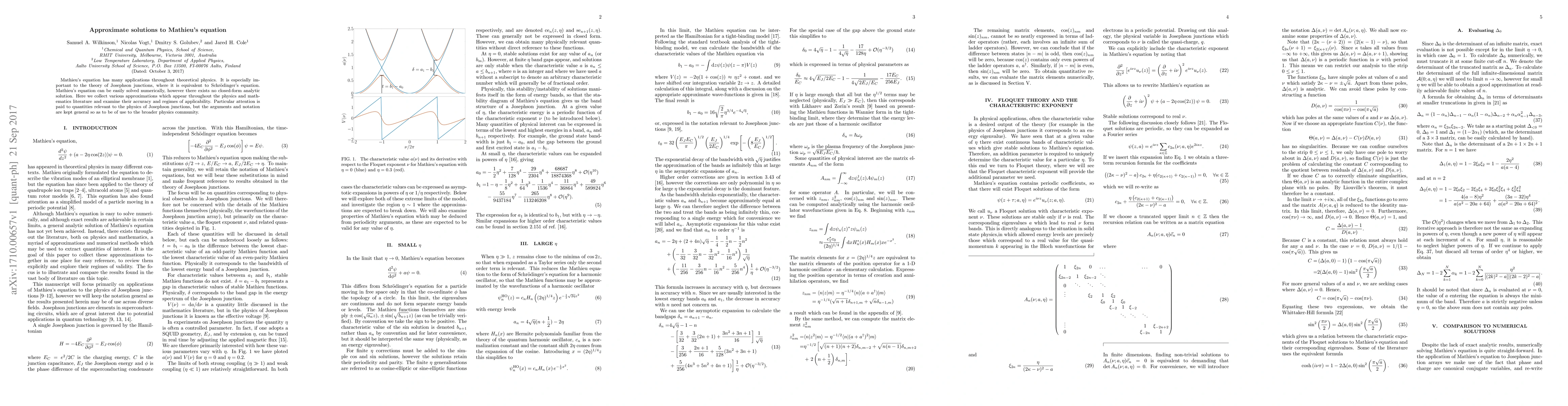 Mathieu's equation has many applications throughout theoretical physics. It is especially important to the theory of Josephson junctions, where it is equivalent to Schrodinger's equation. Mathieu's equation can be easily solved numerically, however there exists no closed-form analytic solution. Here we collect various approximations which appear throughout the physics and mathematics literature and examine their accuracy and regimes of applicability. Particular attention is paid to quantities relevant to the physics of Josephson junctions, but the arguments and notation are kept general so as to be of use to the broader physics community.