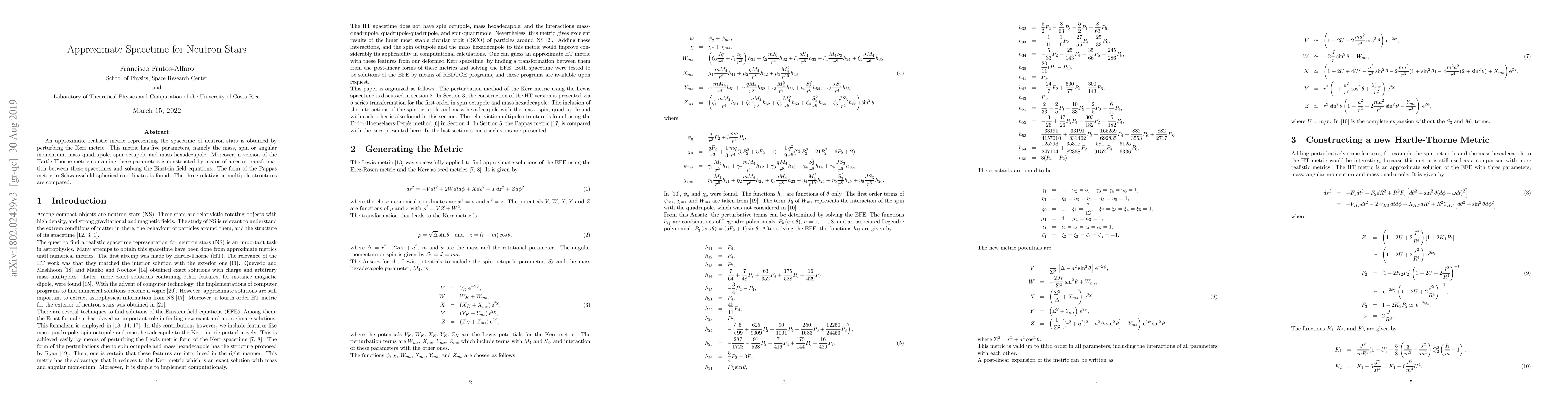 An approximate realistic metric representing the spacetime of neutron stars is obtained by perturbing the Kerr metric. This metric has five parameters, namely the mass, spin or angular momentum, mass quadrupole, spin octupole and mass hexadecapole. Moreover, a version of the Hartle-Thorne metric containing these parameters is constructed by means of a series transformation between these spacetimes and solving the Einstein field equations. The form of the Pappas metric in Schwarzschild spherical coordinates is found. The three relativistic multipole structures are compared.