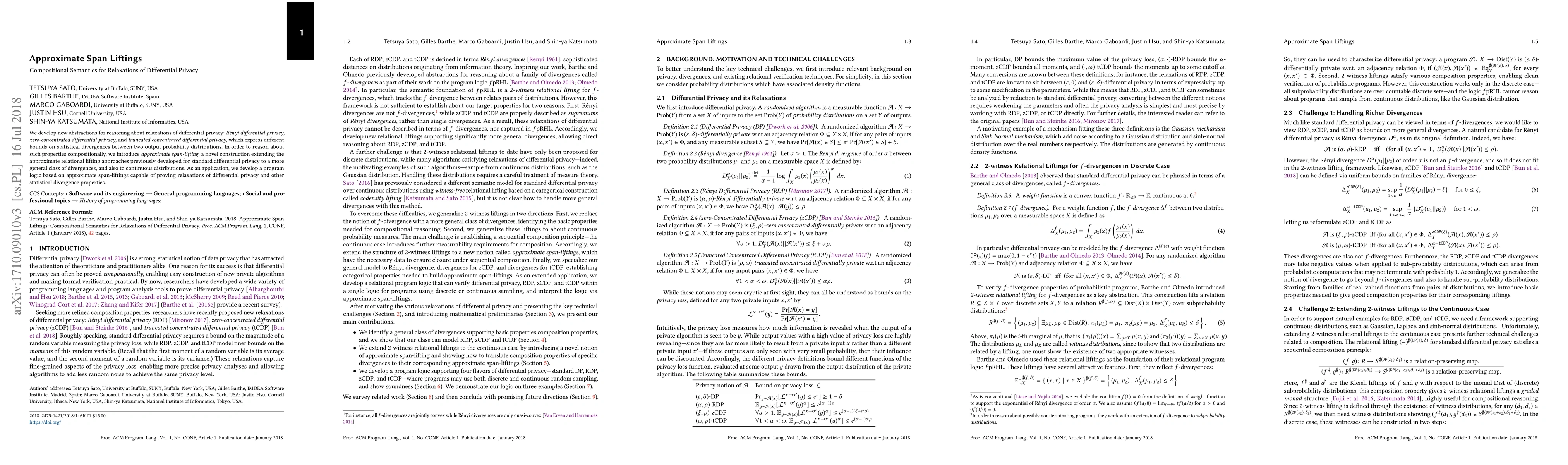 This paper introduces new abstractions for various relaxations of differential privacy and presents approximate span-liftings as a compositional reasoning tool for these relaxations, extending previous methods to handle continuous distributions and diverse statistical divergences. The authors develop a program logic based on these liftings to prove properties of differential privacy and other statistical divergences.