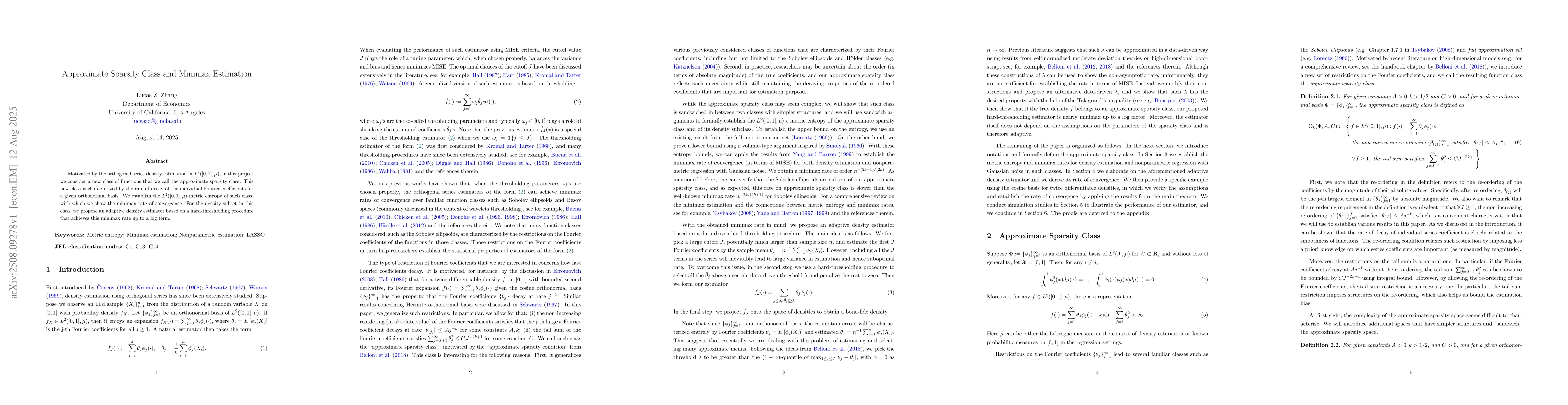 Motivated by the orthogonal series density estimation in $L^2([0,1],\mu)$, in this project we consider a new class of functions that we call the approximate sparsity class. This new class is characterized by the rate of decay of the individual Fourier coefficients for a given orthonormal basis. We establish the $L^2([0,1],\mu)$ metric entropy of such class, with which we show the minimax rate of convergence. For the density subset in this class, we propose an adaptive density estimator based on a hard-thresholding procedure that achieves this minimax rate up to a $\log$ term.
