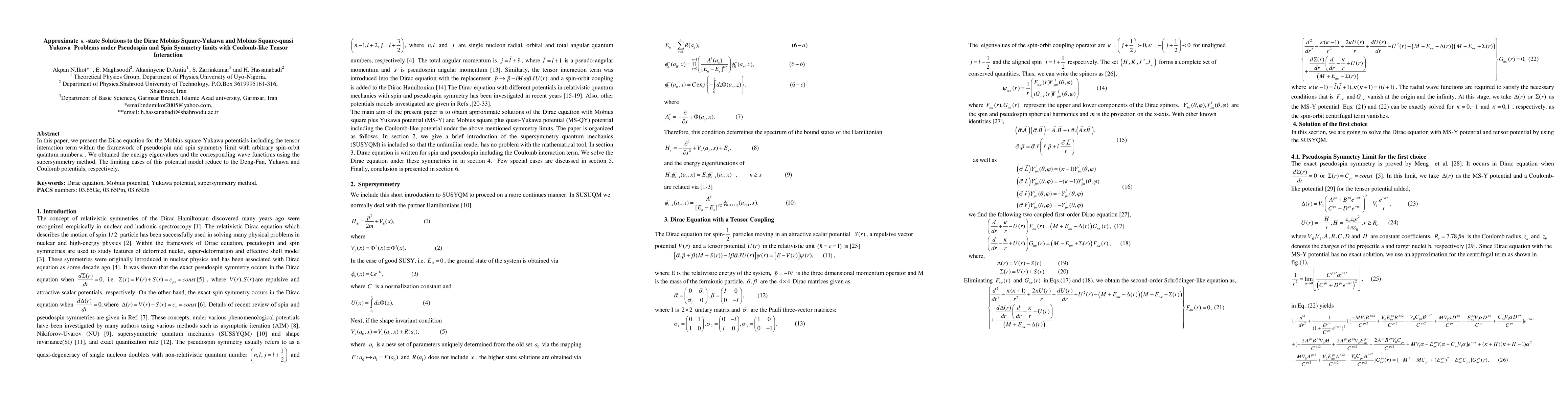 This paper explores the Dirac equation for Mobius-square-Yukawa potentials with tensor interactions under pseudospin and spin symmetry limits, obtaining energy eigenvalues and wave functions via the supersymmetry method. The model's limiting cases include the Deng-Fan, Yukawa, and Coulomb potentials.