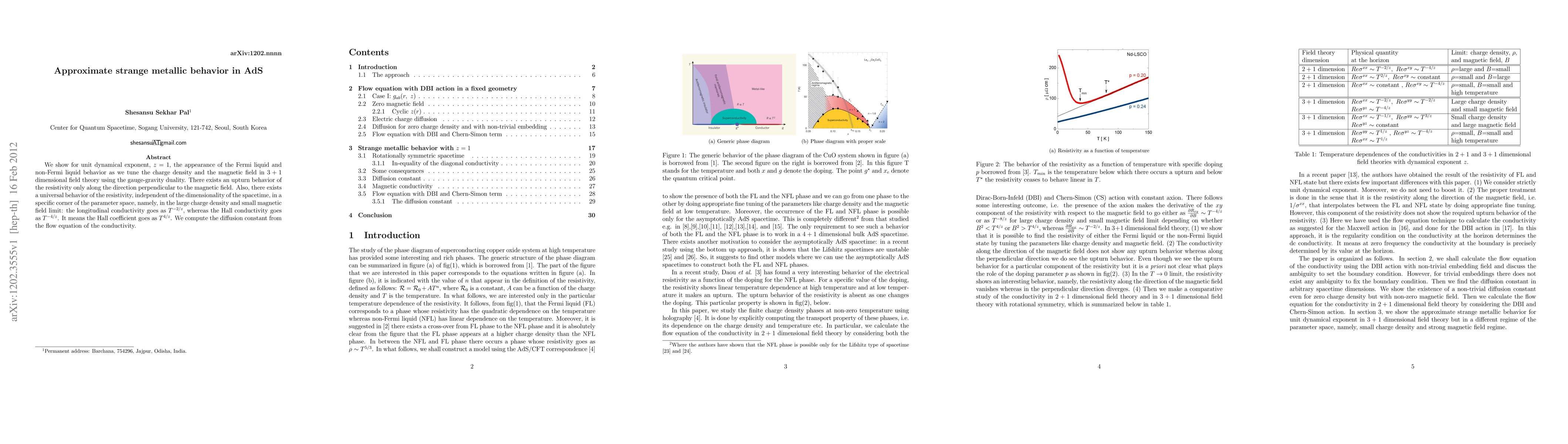 The paper demonstrates, via gauge-gravity duality, the emergence of Fermi liquid and non-Fermi liquid behaviors in a 3+1D field theory by adjusting charge density and magnetic field. It identifies a unique resistivity upturn perpendicular to the magnetic field and a universal resistivity behavior, independent of spacetime dimensionality, at high charge density and low magnetic field. Here, longitudinal conductivity scales with temperature as T^(-2/z), Hall conductivity as T^(-4/z), and the Hall coefficient as T^(4/z). The diffusion constant is calculated from the conductivity flow equation.
