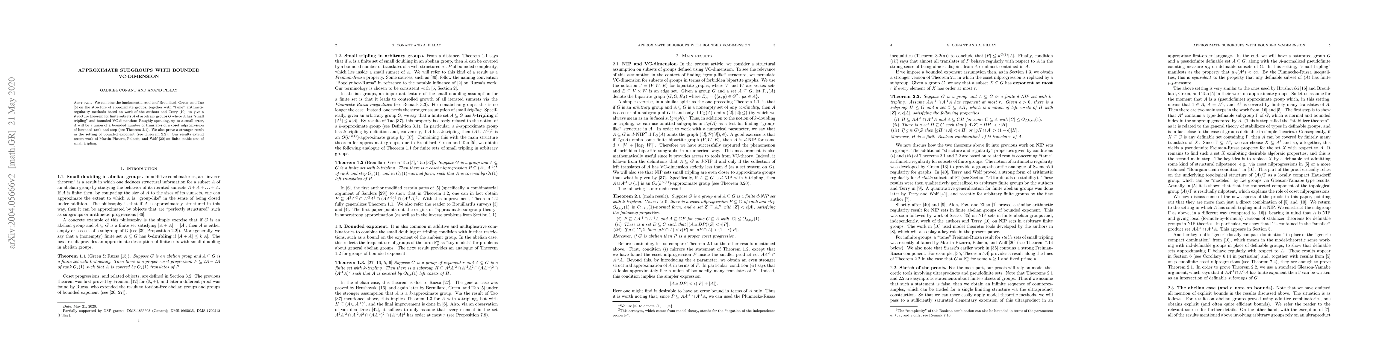 This paper combines results on the structure of approximate groups and "tame" arithmetic regularity methods to develop a structure theorem for finite subsets of arbitrary groups with small tripling and bounded VC-dimension. The theorem shows that such subsets can be approximated by a union of a bounded number of translates of coset nilprogressions of bounded rank and step.