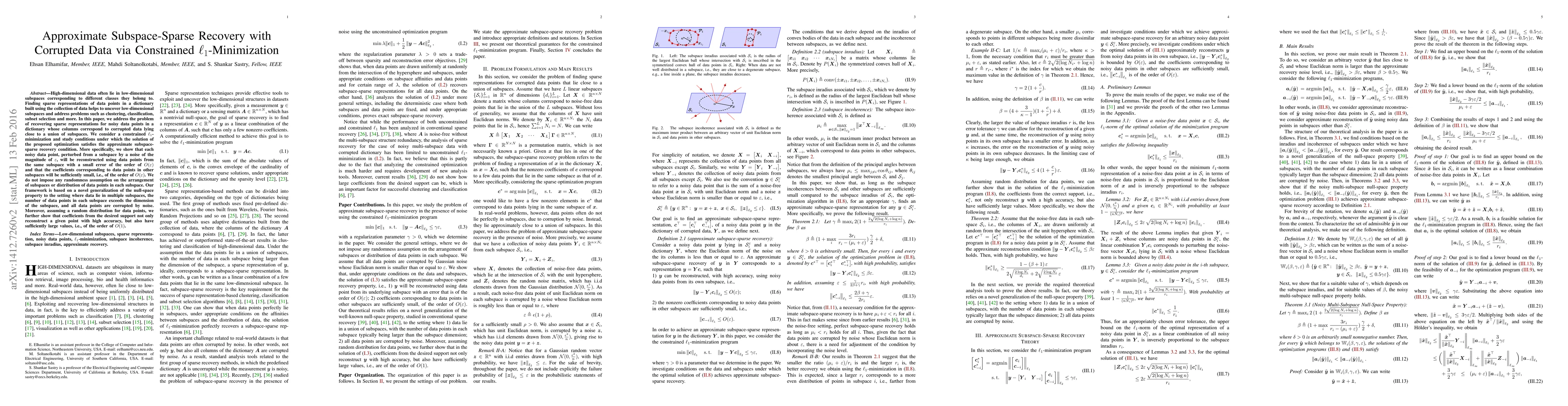 This paper explores the recovery of sparse representations for noisy data points in a dictionary, focusing on scenarios where data lie close to a union of subspaces. It proposes a constrained $\ell_1$-minimization approach to achieve approximate subspace-sparse recovery, demonstrating that noisy data can be reconstructed with small error and that coefficients from irrelevant subspaces are sufficiently small.