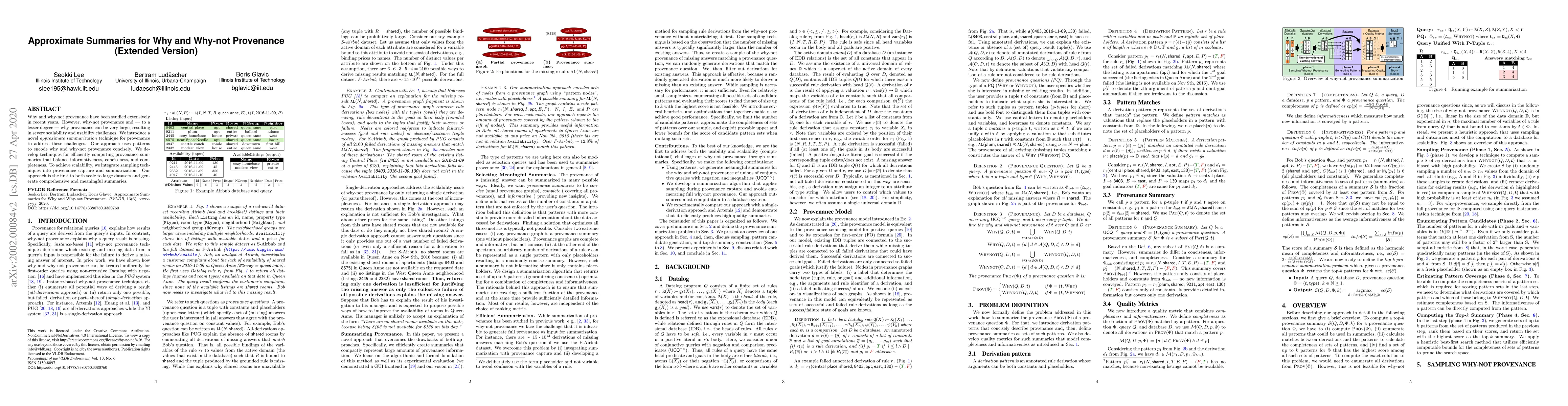 This paper introduces an innovative approximate summarization technique for provenance, addressing scalability issues with large why and why-not provenance data. The method employs patterns and sampling to efficiently generate concise, informative, and comprehensive summaries, enabling scalability for large datasets.