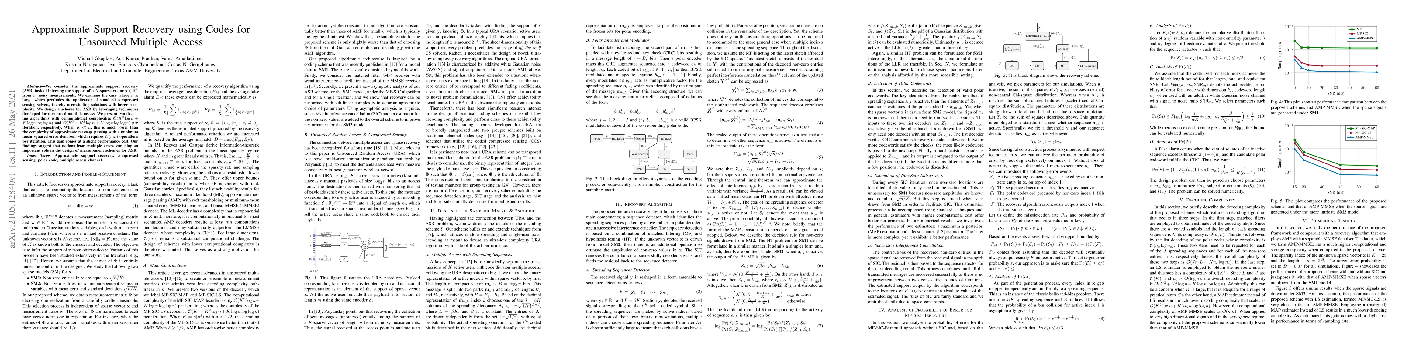 We consider the approximate support recovery (ASR) task of inferring the support of a $K$-sparse vector ${\bf x} \in \mathbb{R}^n$ from $m$ noisy measurements. We examine the case where $n$ is large, which precludes the application of standard compressed sensing solvers, thereby necessitating solutions with lower complexity. We design a scheme for ASR by leveraging techniques developed for unsourced multiple access. We present two decoding algorithms with computational complexities $\mathcal{O}(K^2 \log n+K \log n \log \log n)$ and $\mathcal{O}(K^3 +K^2 \log n+ K \log n \log \log n)$ per iteration, respectively. When $K \ll n$, this is much lower than the complexity of approximate message passing with a minimum mean squared error denoiser% (AMP-MMSE) ,which requires $\mathcal{O}(mn)$ operations per iteration. This gain comes at a slight performance cost. Our findings suggest that notions from multiple access %such as spreading, matched filter receivers and codes can play an important role in the design of measurement schemes for ASR.