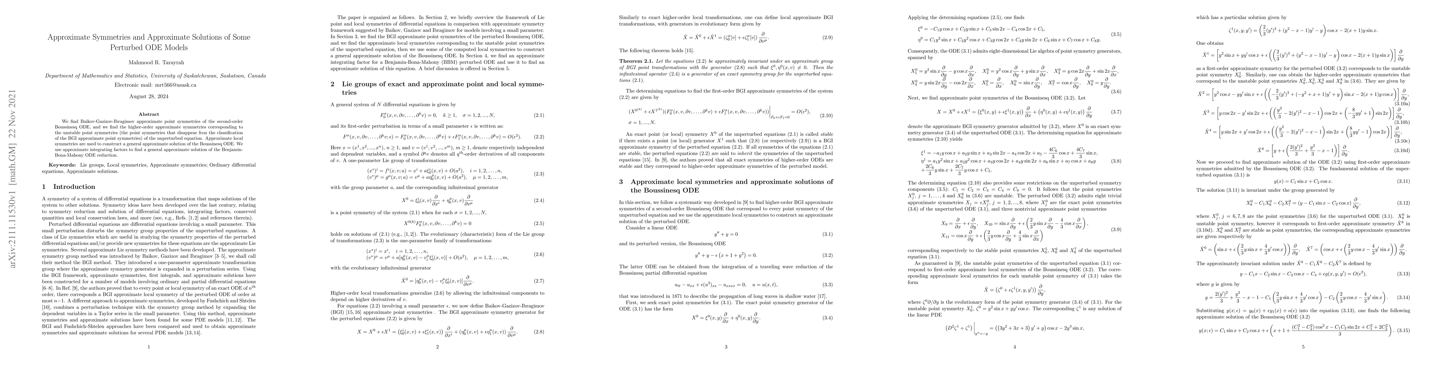 This paper explores Baikov-Gazizov-Ibragimov approximate point symmetries for the second-order Boussinesq ODE and higher-order approximate symmetries for unstable point symmetries of the unperturbed equation. It constructs general approximate solutions using approximate local symmetries and integrating factors for both the Boussinesq and Benjamin-Bona-Mahony ODEs.