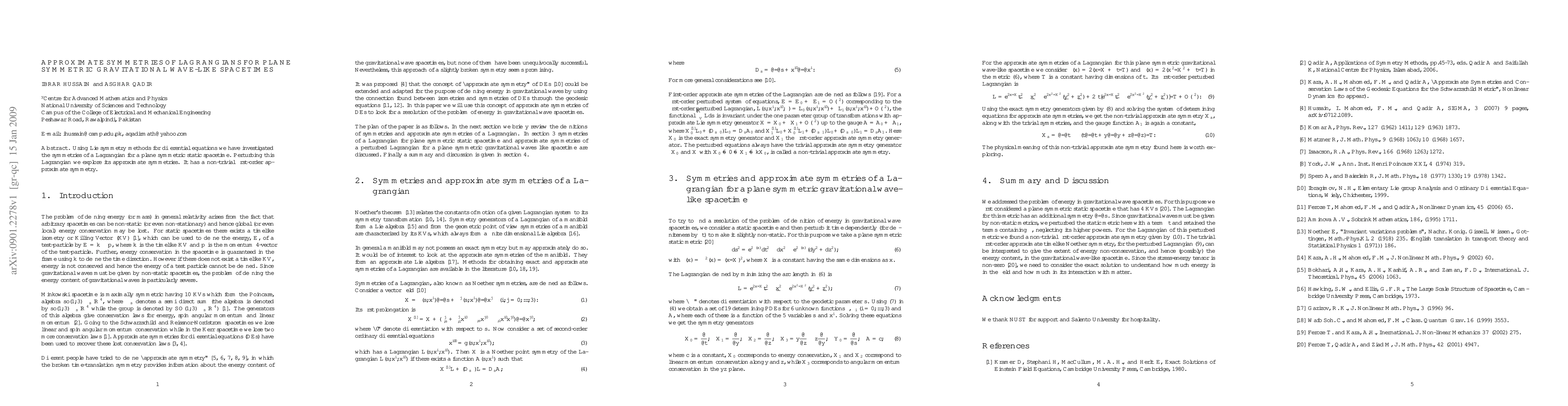 Using Lie symmetry methods for differential equations we have investigated the symmetries of a Lagrangian for a plane symmetric static spacetime. Perturbing this Lagrangian we explore its approximate symmetries. It has a non-trivial first-order approximate symmetry.