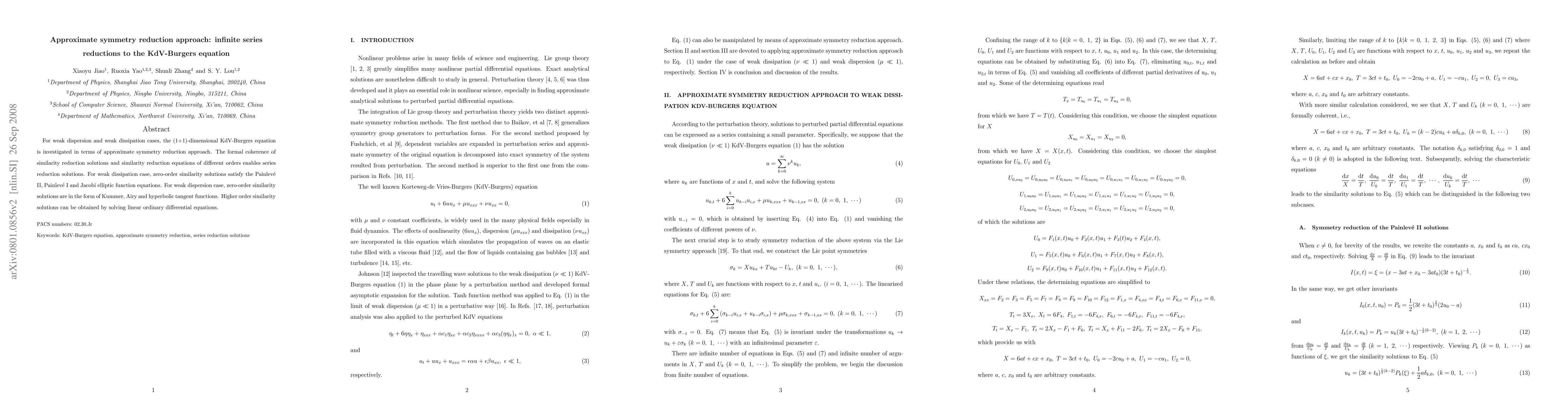 This paper explores the (1+1)-dimensional KdV-Burgers equation under weak dispersion and dissipation using an approximate symmetry reduction approach. It derives series reduction solutions, showing that zero-order similarity solutions correspond to Painlevé II, Painlevé I, and Jacobi elliptic function equations for weak dissipation, and Kummer, Airy, and hyperbolic tangent functions for weak dispersion.