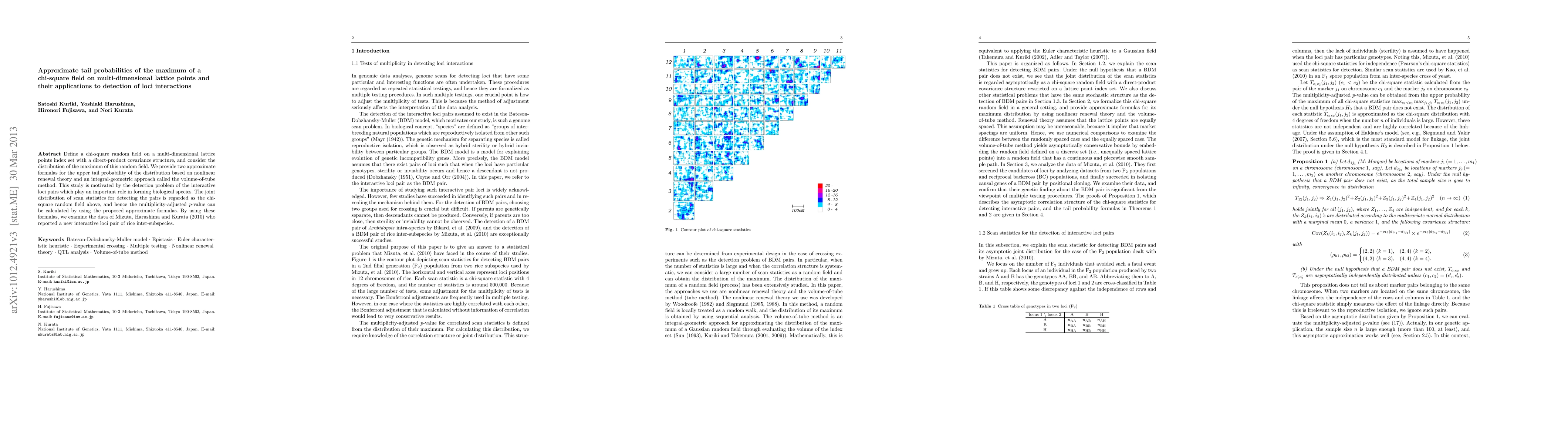 Define a chi-square random field on a multi-dimensional lattice points index set with a direct-product covariance structure, and consider the distribution of the maximum of this random field. We provide two approximate formulas for the upper tail probability of the distribution based on nonlinear renewal theory and an integral-geometric approach called the volume-of-tube method. This study is motivated by the detection problem of the interactive loci pairs which play an important role in forming biological species. The joint distribution of scan statistics for detecting the pairs is regarded as the chi-square random field above, and hence the multiplicity-adjusted $p$-value can be calculated by using the proposed approximate formulas. By using these formulas, we examine the data of Mizuta, et al. (2010) who reported a new interactive loci pair of rice inter-subspecies.
