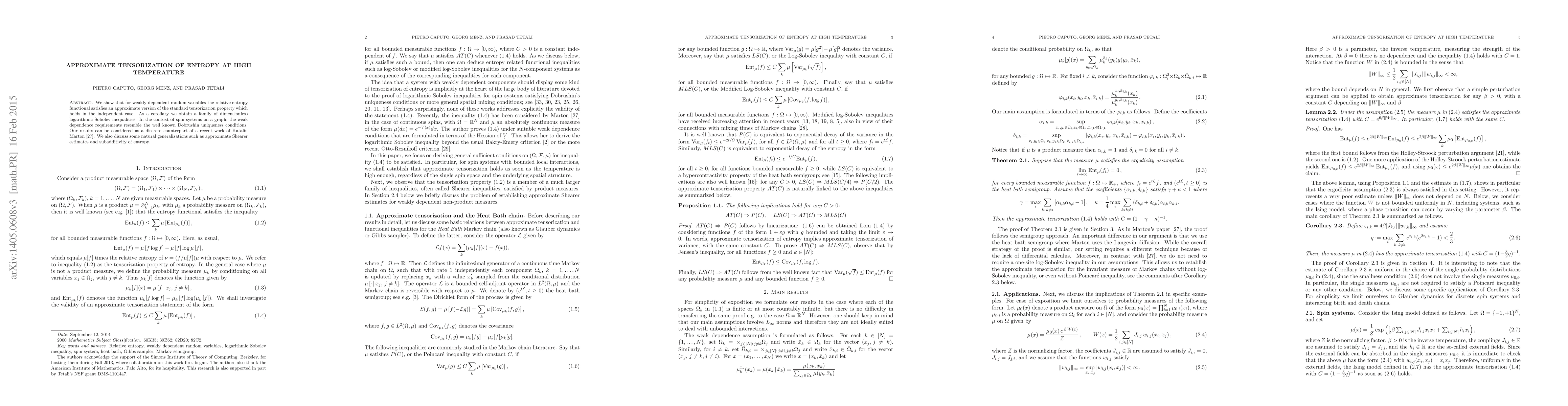 This paper demonstrates an approximate tensorization property for relative entropy in weakly dependent random variables, extending the standard property seen in independent cases. It also derives a set of logarithmic Sobolev inequalities and discusses their relevance to spin systems, providing a discrete analogue to recent continuous work.