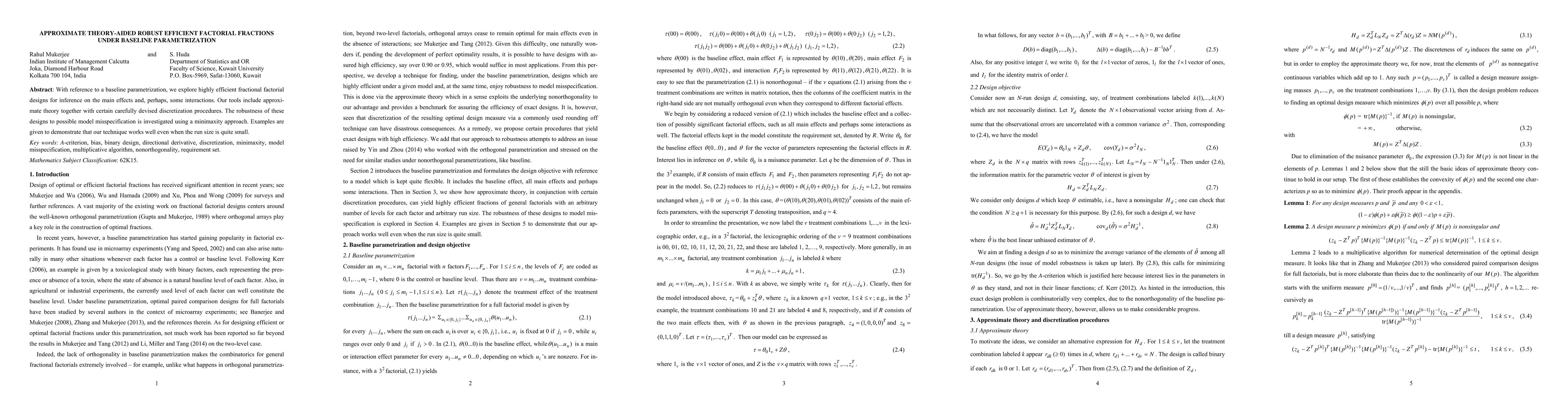 With reference to a baseline parametrization, we explore highly efficient fractional factorial designs for inference on the main effects and, perhaps, some interactions. Our tools include approximate theory together with certain carefully devised discretization procedures. The robustness of these designs to possible model misspecification is investigated using a minimaxity approach. Examples are given to demonstrate that our technique works well even when the run size is quite small.