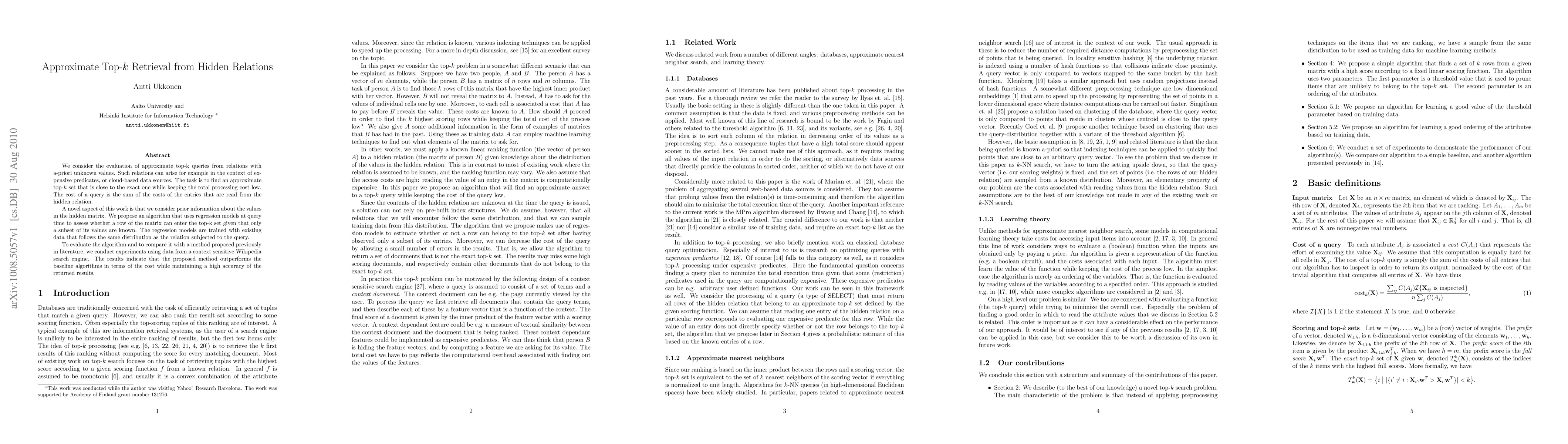 We consider the evaluation of approximate top-k queries from relations with a-priori unknown values. Such relations can arise for example in the context of expensive predicates, or cloud-based data sources. The task is to find an approximate top-k set that is close to the exact one while keeping the total processing cost low. The cost of a query is the sum of the costs of the entries that are read from the hidden relation. A novel aspect of this work is that we consider prior information about the values in the hidden matrix. We propose an algorithm that uses regression models at query time to assess whether a row of the matrix can enter the top-k set given that only a subset of its values are known. The regression models are trained with existing data that follows the same distribution as the relation subjected to the query. To evaluate the algorithm and to compare it with a method proposed previously in literature, we conduct experiments using data from a context sensitive Wikipedia search engine. The results indicate that the proposed method outperforms the baseline algorithms in terms of the cost while maintaining a high accuracy of the returned results.