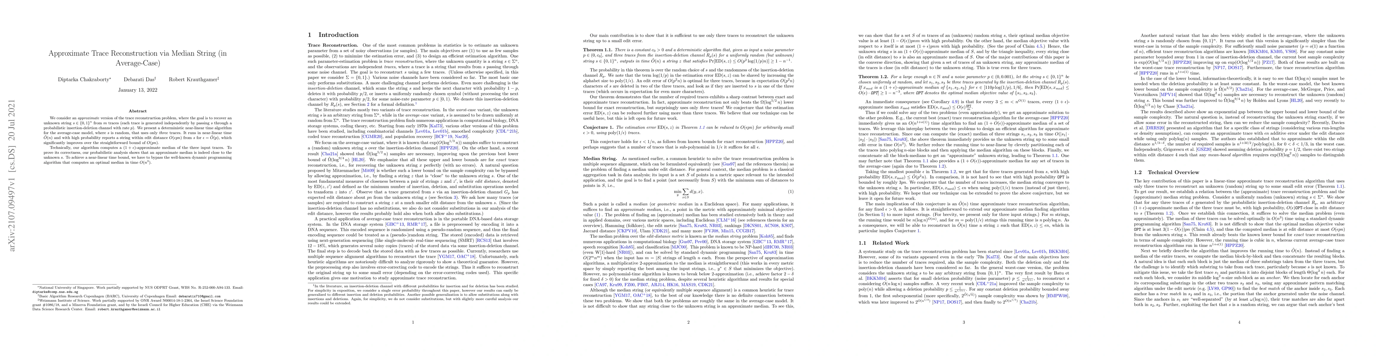 We consider an \emph{approximate} version of the trace reconstruction problem, where the goal is to recover an unknown string $s\in\{0,1\}^n$ from $m$ traces (each trace is generated independently by passing $s$ through a probabilistic insertion-deletion channel with rate $p$). We present a deterministic near-linear time algorithm for the average-case model, where $s$ is random, that uses only \emph{three} traces. It runs in near-linear time $\tilde O(n)$ and with high probability reports a string within edit distance $O(\epsilon p n)$ from $s$ for $\epsilon=\tilde O(p)$, which significantly improves over the straightforward bound of $O(pn)$. Technically, our algorithm computes a $(1+\epsilon)$-approximate median of the three input traces. To prove its correctness, our probabilistic analysis shows that an approximate median is indeed close to the unknown $s$. To achieve a near-linear time bound, we have to bypass the well-known dynamic programming algorithm that computes an optimal median in time $O(n^3)$.
