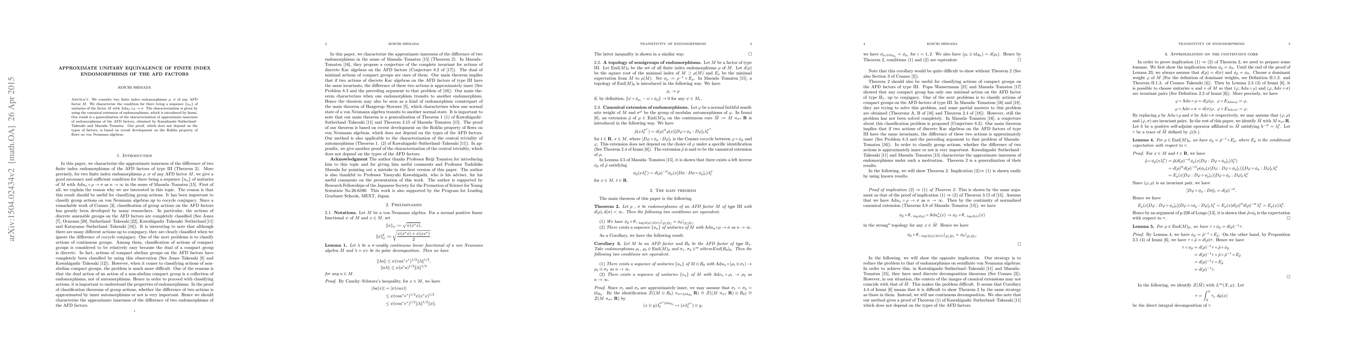 This paper characterizes conditions for two finite index endomorphisms on AFD factors to be approximately unitarily equivalent using Izumi's canonical extension. It generalizes previous results on approximate innerness and employs recent developments on the Rohlin property of flows on von Neumann algebras.