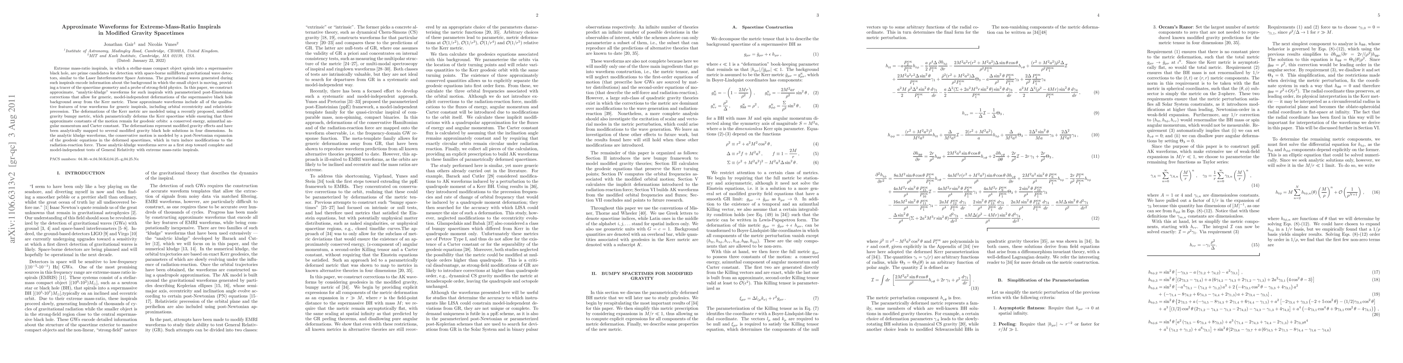 The paper introduces a novel method for constructing approximate waveforms for EMRIs in modified gravity spacetimes, utilizing an analytic-kludge approach with parameterized post-Einsteinian corrections.