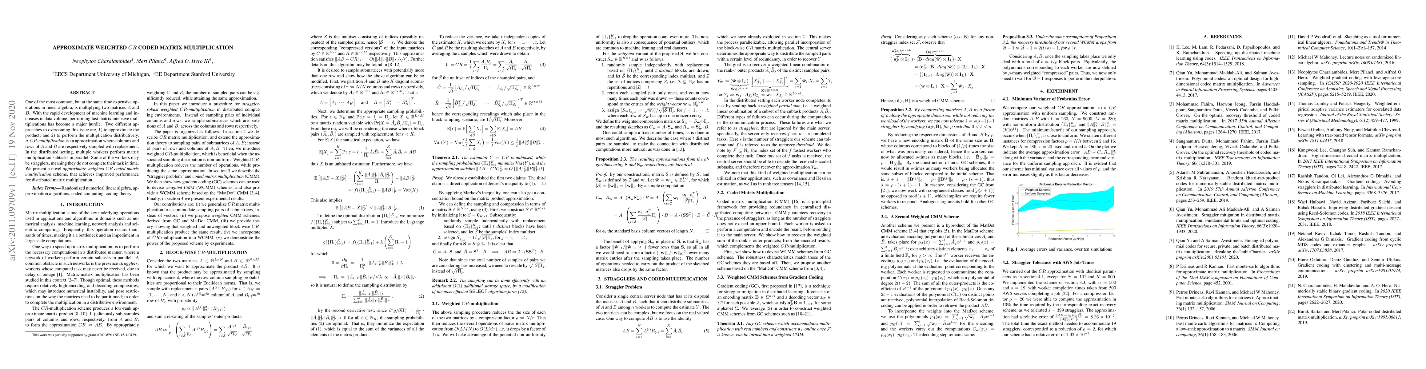 One of the most common, but at the same time expensive operations in linear algebra, is multiplying two matrices $A$ and $B$. With the rapid development of machine learning and increases in data volume, performing fast matrix intensive multiplications has become a major hurdle. Two different approaches to overcoming this issue are, 1) to approximate the product; and 2) to perform the multiplication distributively. A \textit{$CR$-multiplication} is an approximation where columns and rows of $A$ and $B$ are respectively sampled with replacement. In the distributed setting, multiple workers perform matrix multiplication subtasks in parallel. Some of the workers may be stragglers, meaning they do not complete their task in time. We present a novel \textit{approximate weighted $CR$ coded matrix multiplication} scheme, that achieves improved performance for distributed matrix multiplication.